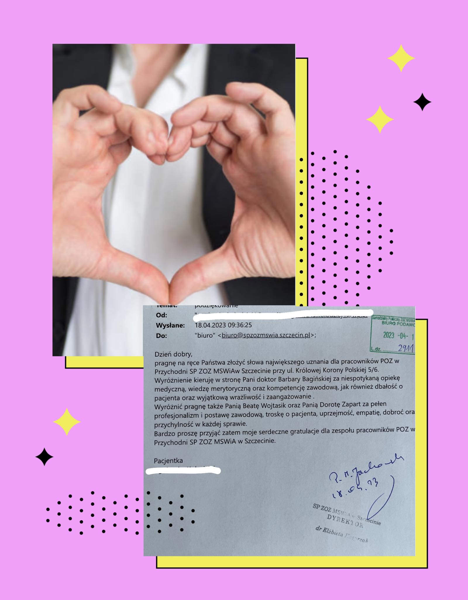 Zdrowotnej ul. Królowej Korony Polskiej 5/6 Szczecin. W tym szczególne słowa podziękowania dla lekarza Barbary Bagińskiej za opiekę medyczną i podkreślono ogromną wiedzę i doświadczenie Pani Doktor. Uznanie także dla zespołu tj. Pani Beaty Wojtasik oraz Pani Doroty Zapart. W opinii pacjentki Panie są zawsze pomocne, empatyczne oraz profesjonalne. Bardzo nas cieszą takie słowa…