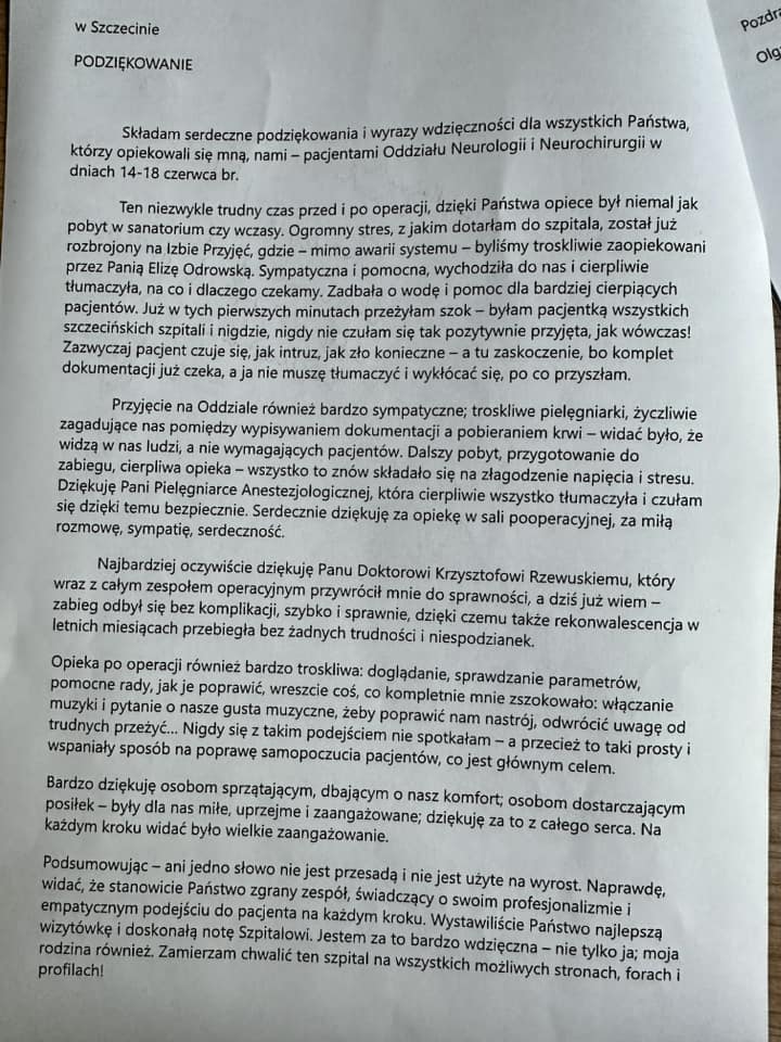 Prawdą jest, że empatia, życzliwość i zrozumienie potrzeb drugiego człowieka są wyrazem profesjonalizmu w pracy w szpitalu. Składa się na to codzienne działanie całego zespołu na wszystkich szczeblach. Tak więc, przyjemnie się czyta podziękowanie, które do nas wpłynęło. W tym przypadku pacjentka dziękuje osobom, z którymi miała do czynienia w całym procesie leczenia. Wspomina początek czyli przyjęcie w Planowej Izbie Przyjęć - tutaj egzamin na bardzo dobrą ocenę zdała Pani Eliza Odrowska i zespół. Dalej wychwala pielęgniarki, opiekunów medycznych podczas przygotowania do zabiegu w Oddziale Neurochirurgii, a także w sali pooperacyjnej. Wyrazy wielkiego uznania kieruje dla dr n.med. Krzysztofa Rzewuskiego - przeprowadzającego zabieg. Podsumowując wszyscy włącznie z zespołem pomocniczym otrzymali podziękowanie. Na koniec porównuje pobyt w szpitalu do wczasów czy sanatorium.