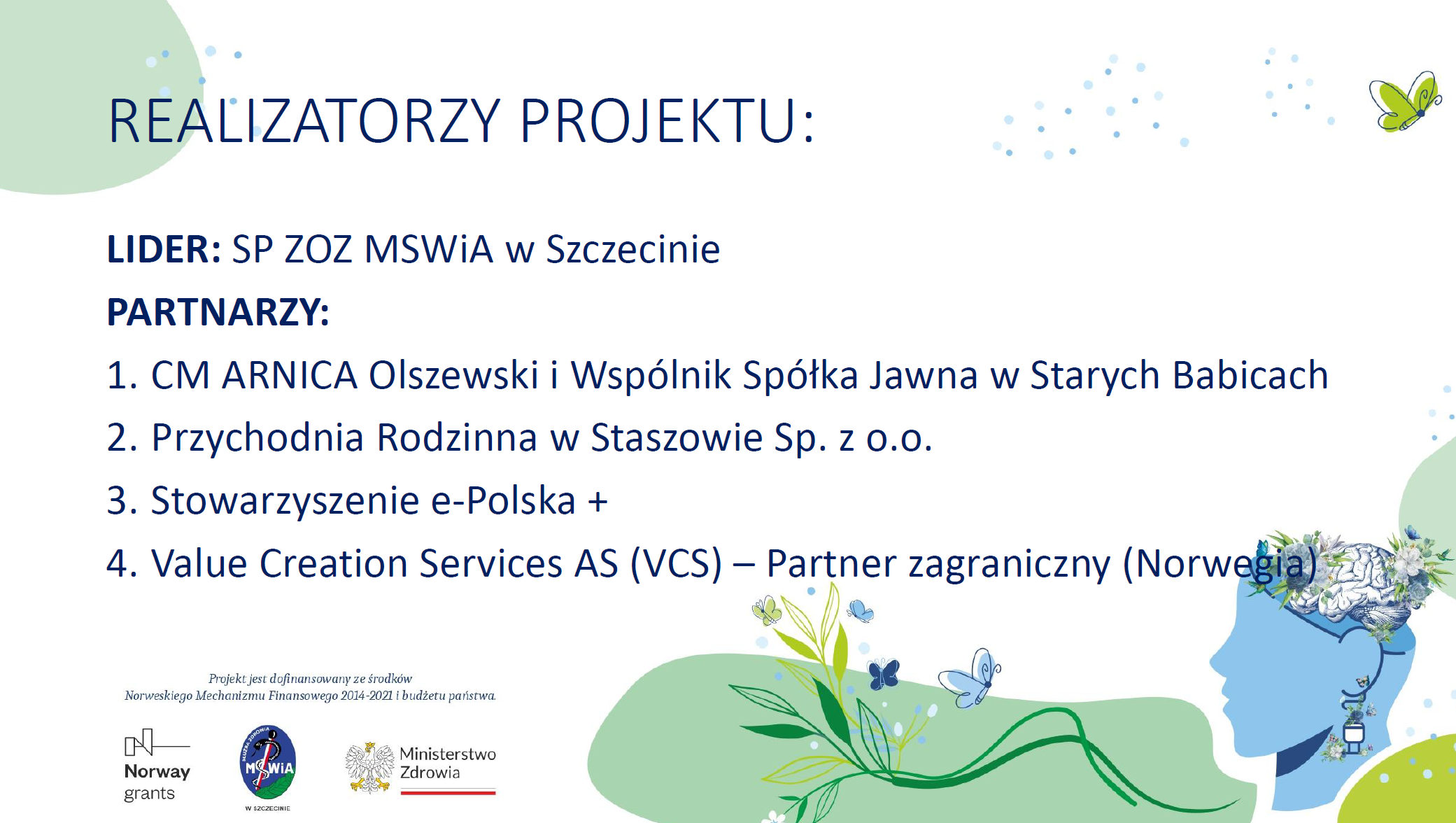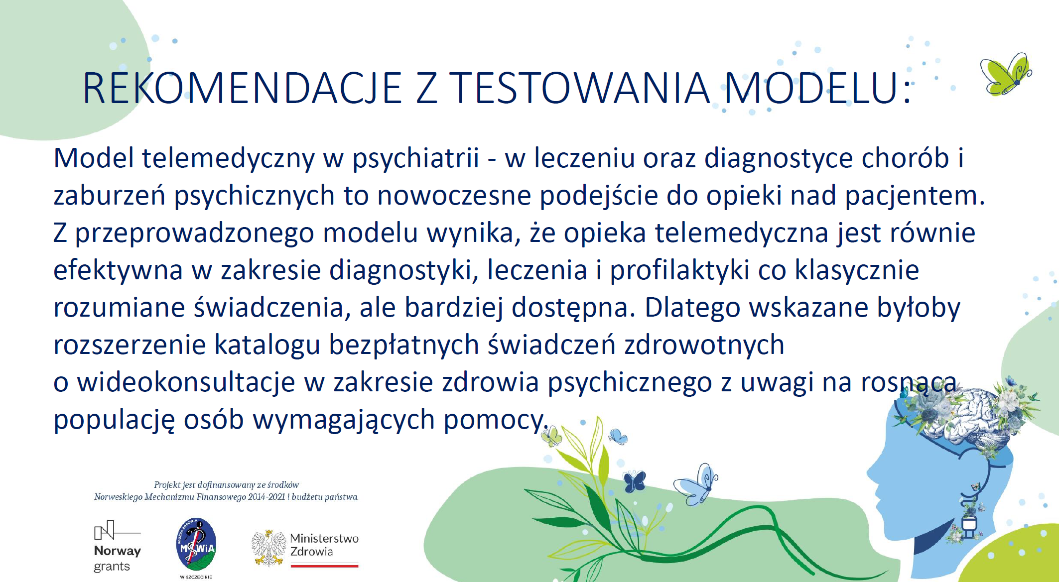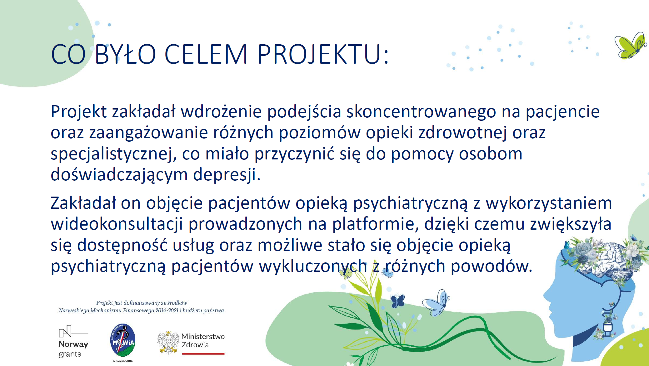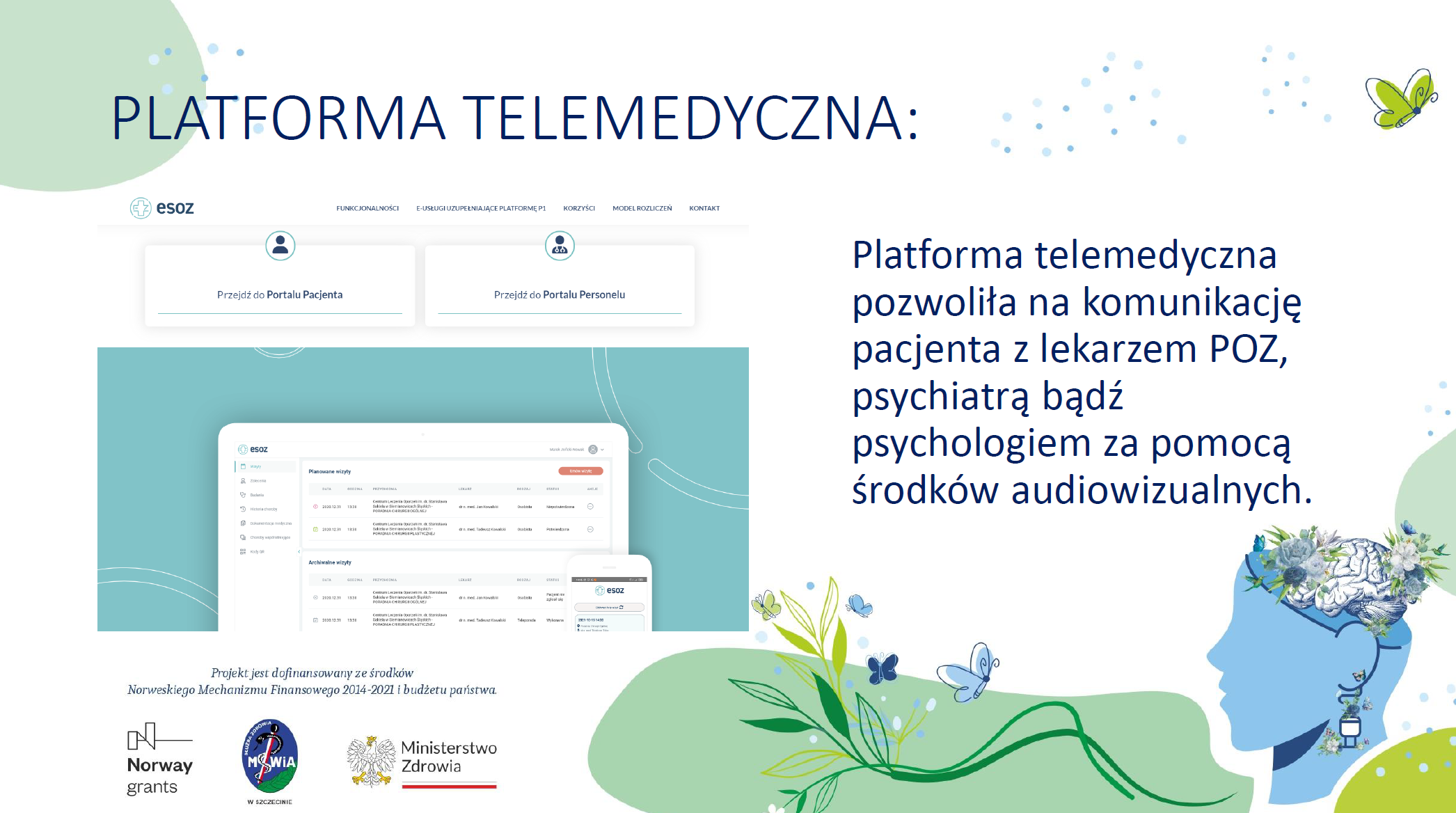 Wdrażanie i wykorzystanie wideokonferencji w diagnostyce i leczeniu depresji – model telemedyczny w dziedzinie psychiatrii” dofinansowany jest ze środków Norweskiego Mechanizmu Finansowego 2014-2021 i budżetu państwa.