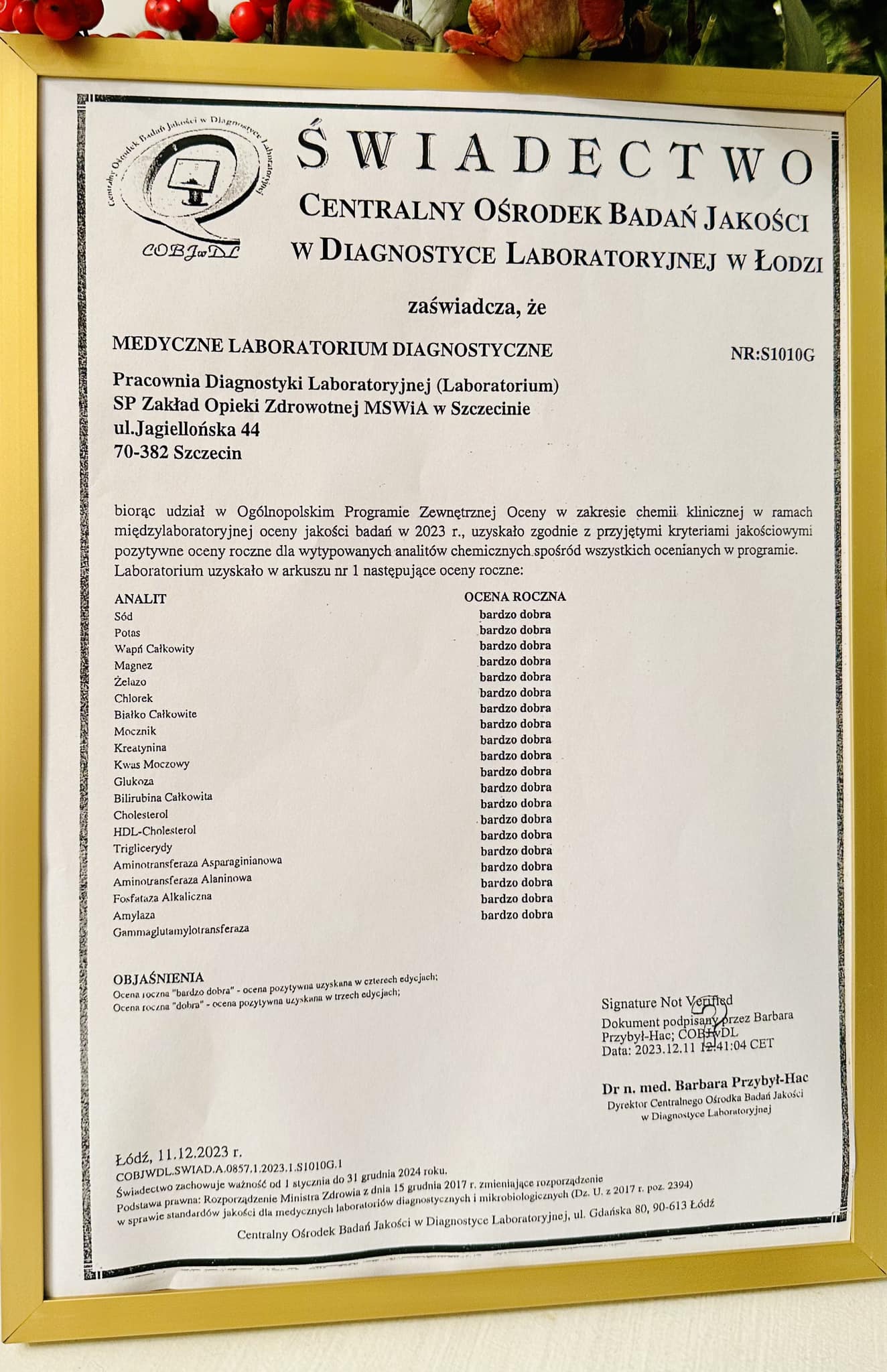 ŚWIADECTWO CENTRALNEGO OŚRODKA BADAŃ JAKOŚCI W DIAGNOSTYCE LABORATORYJNEJ!!