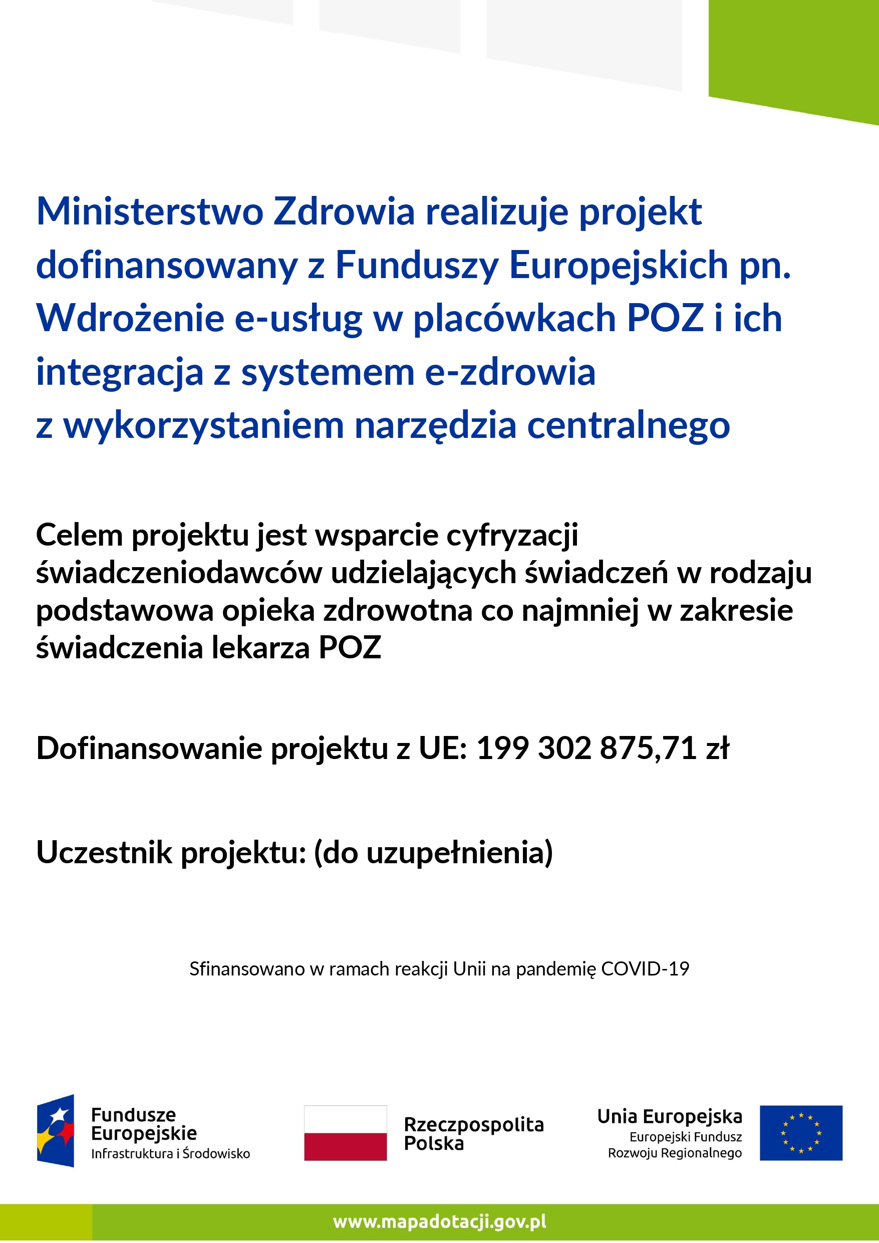 Realizatorem projektu jest Ministerstwo Zdrowia, a jego wartość wynosi 199 302 875,71 zł.