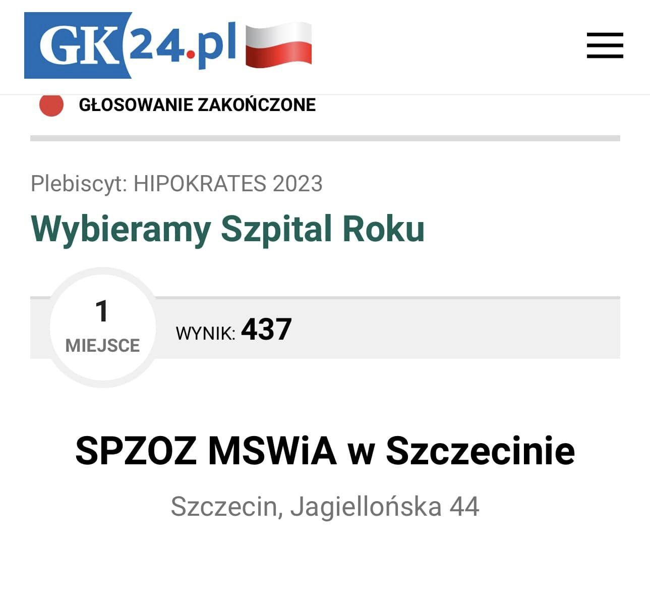 Informujemy, że dzięki głosom naszych pacjentów, sympatyków, tych którzy nam kibicują po raz drugi jesteśmy liderem i zdobyliśmy zaszczytne 1 MIEJSCE w skali województwa, w kategorii SZPITAL ROKU w Plebiscycie Medycznym Hipokrates 2023 roku. To dla nas nagroda ale i motywacja do dalszego rozwoju, podwyższenia kwalifikacji, poszerzania katalogu świadczeń medycznych, zachęcania do współpracy w naszych szeregach, budowania tożsamości marki szpitala wyróżniającego się na tle innych placówek.To wyróżnienie ma na celu zawsze zwiększenie zaufania naszych pacjentów.