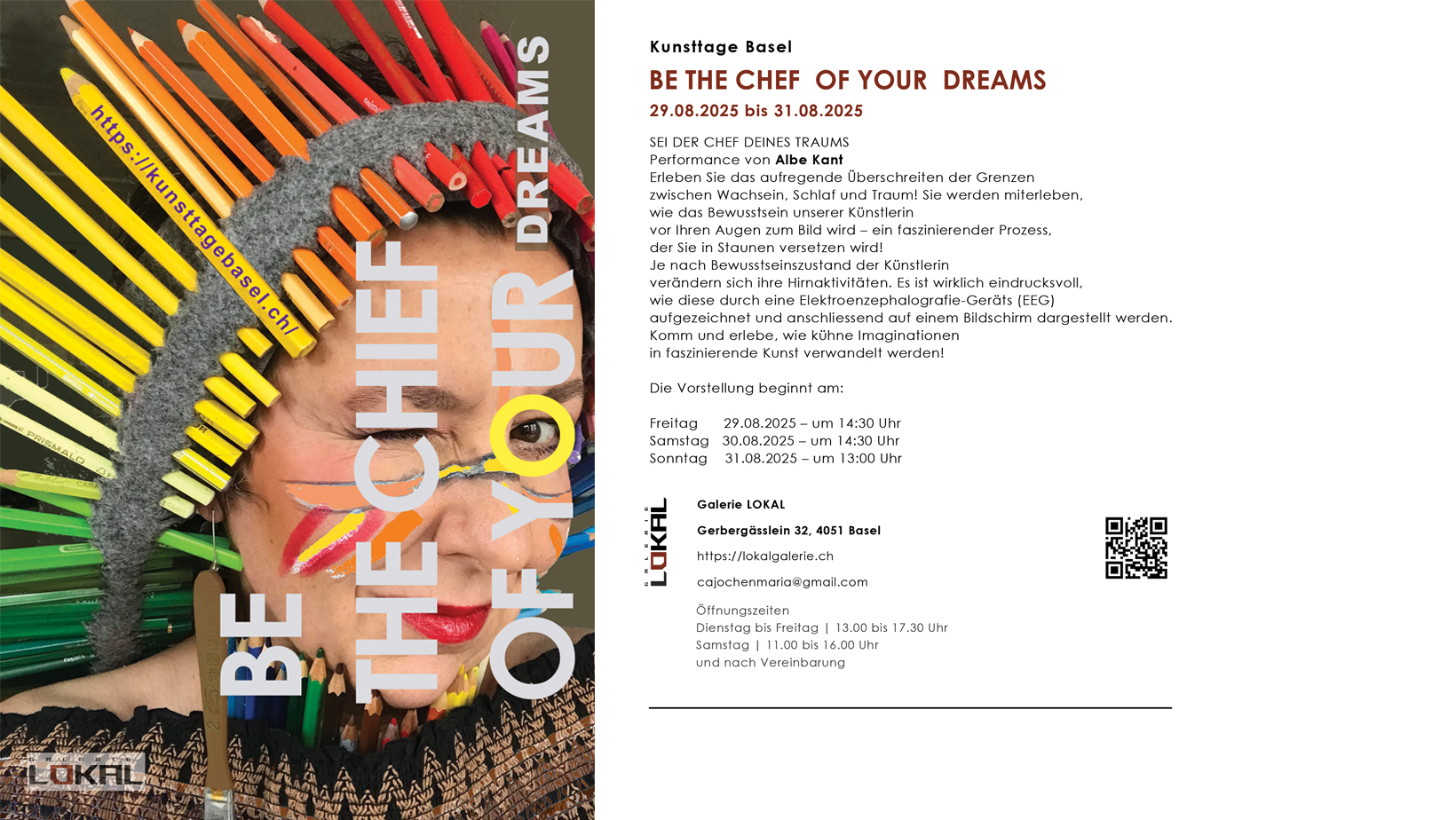 Dans ce cadre, la Galerie LOKAL proposera la performance « Be the Chief of Your Dreams » de l’artiste Albe Kant. Ce projet mettra en lumière le processus de création d’une œuvre picturale – de l’inspiration née d’un rêve jusqu’à la réalisation finale. L’ensemble sera accompagné d’un commentaire scientifique basé sur l’analyse de données EKG et EEG, donnant ainsi à la performance un caractère interdisciplinaire unique. Parallèlement, une exposition de peintures inspirées par les rêves sera présentée.