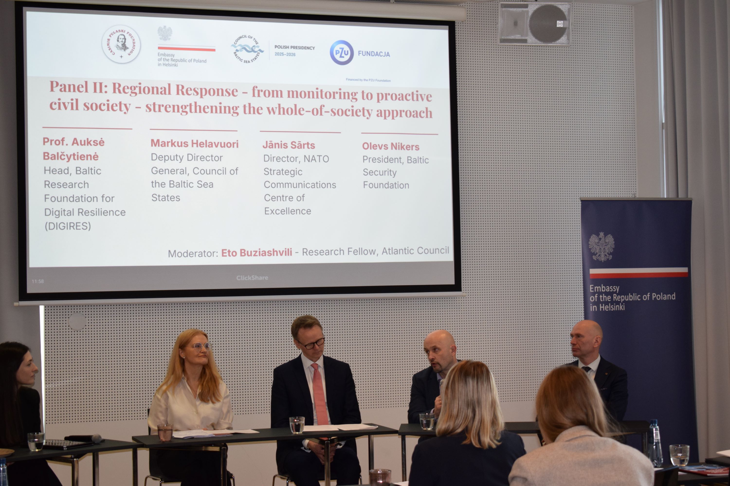 Puolan Helsingin-suurlähetystö järjesti Pulaski-säätiön ja PZU-säätiön tuella Baltic Resilience Initiative seminar - Frontline operationalization: B5+ countries as the Northeast corridor of democratic resilience in the Baltic Sea region - seminaari. Tapahtuma järjestettiin 27. maaliskuuta ja se oli osa Puolan Itämeren valtioiden neuvoston puheenjohtajuuskauden ohjelmaa.