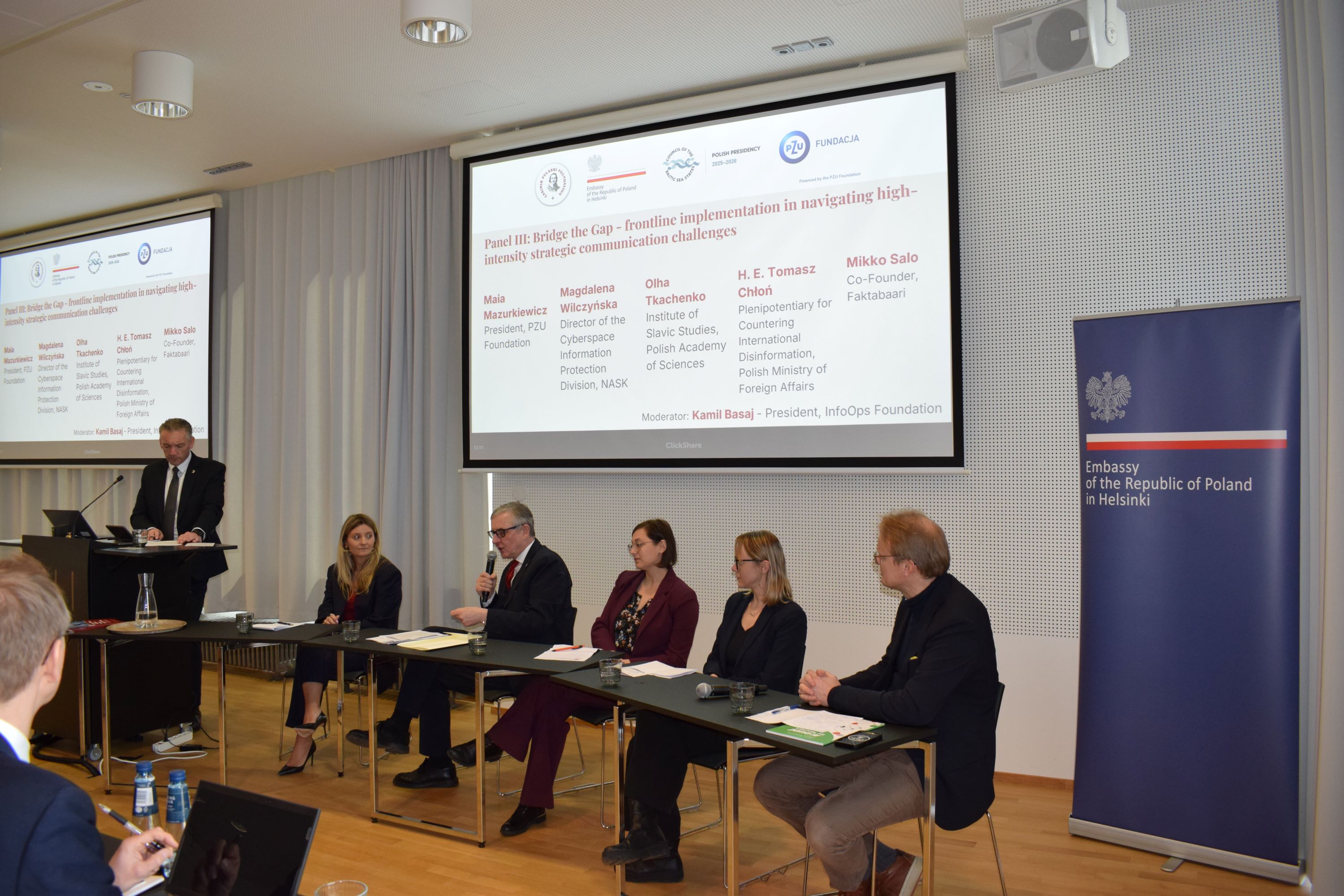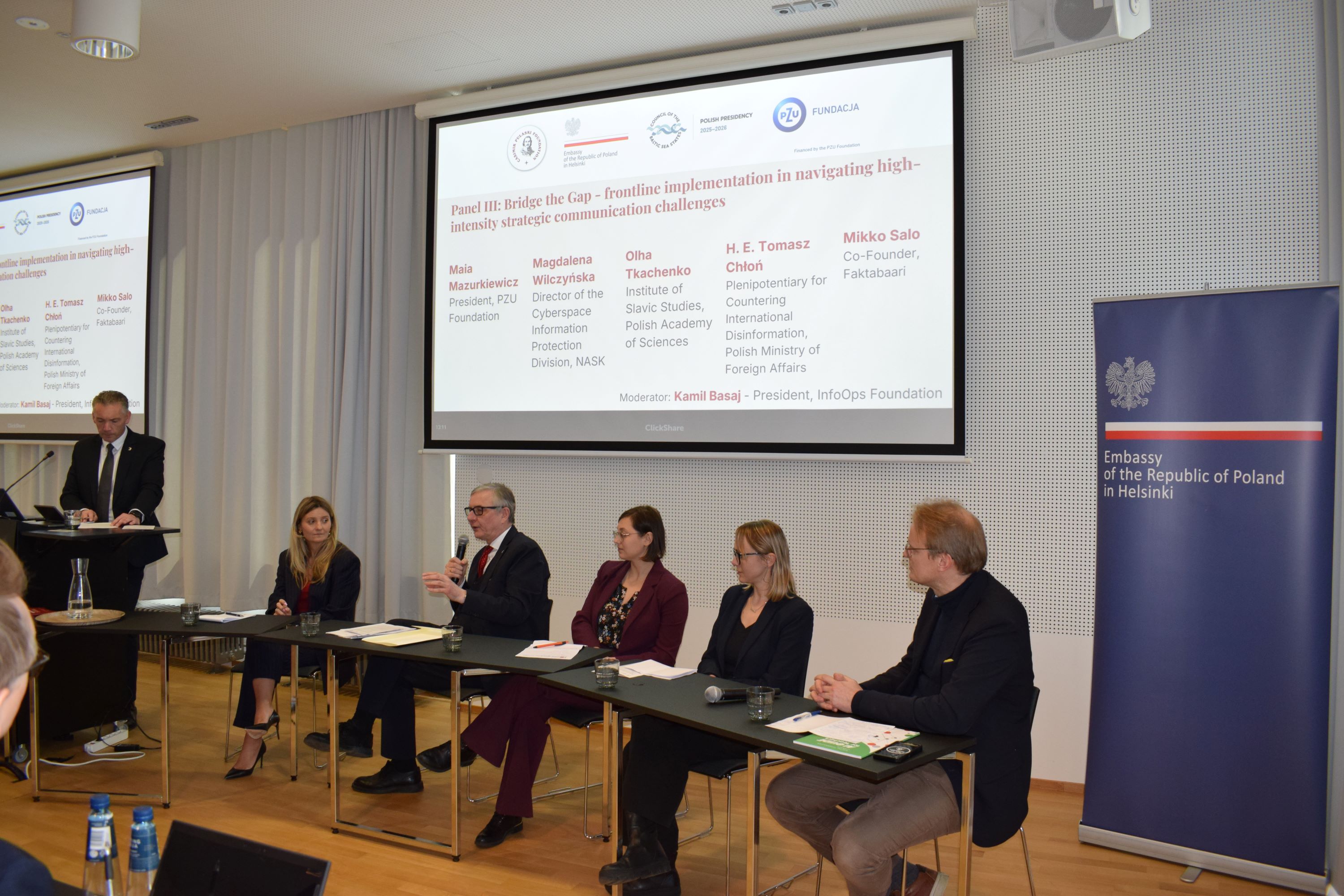 Toinsen paneelin, Regional response – from monitoring to proactive civil society – the strengthening the whole-of-society approach, keskustelussa tarkasteltiin kansalaisyhteiskuntaan kohdistettuja alueellisia aloitteita, joista esimerkkinä oli Baltian maiden tilanne. Kolmas paneeli, Bridge the gap – frontline implementation in navigating high-intensity strategic communication challenges, keskittyi esimerkkeihin Puolasta ja Ukrainasta. Esittelijöinä toimivat Maja Mazurkiewicz, Tomasz Chłoń, Magdalena Wilczyńska (NASK) ja Olha Tkachenko (Slaavilaisten tutkimusten instituutti, Puolan tiedeakatemia).