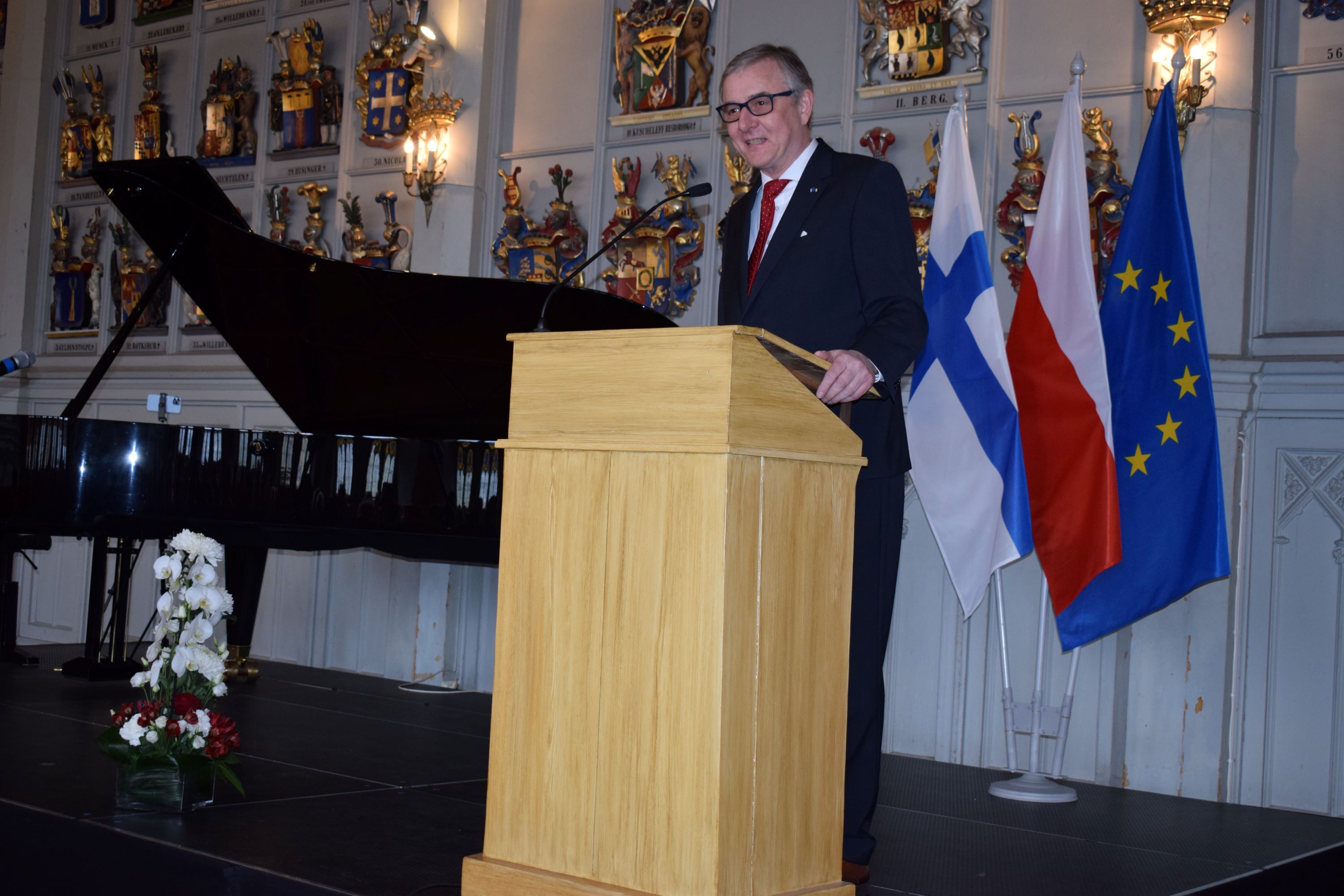 Edustuston päällikkö Tomasz Chłoń korosti 3. toukokuuta hyväksytyn perustuslain historiallista taustaa ja päätavoitteita puheessaan. Hän viittasi ihanteisiin jotka ohjasivat asiakirjan perustajia ja perustuslain perintöön. Puolan ja Suomen välisistä suhteista hän korosti niiden historiallisesti korkeinta tasoa, myös EU:n ja Naton puitteissa sekä Ukrainan auttamisen yhteydessä.