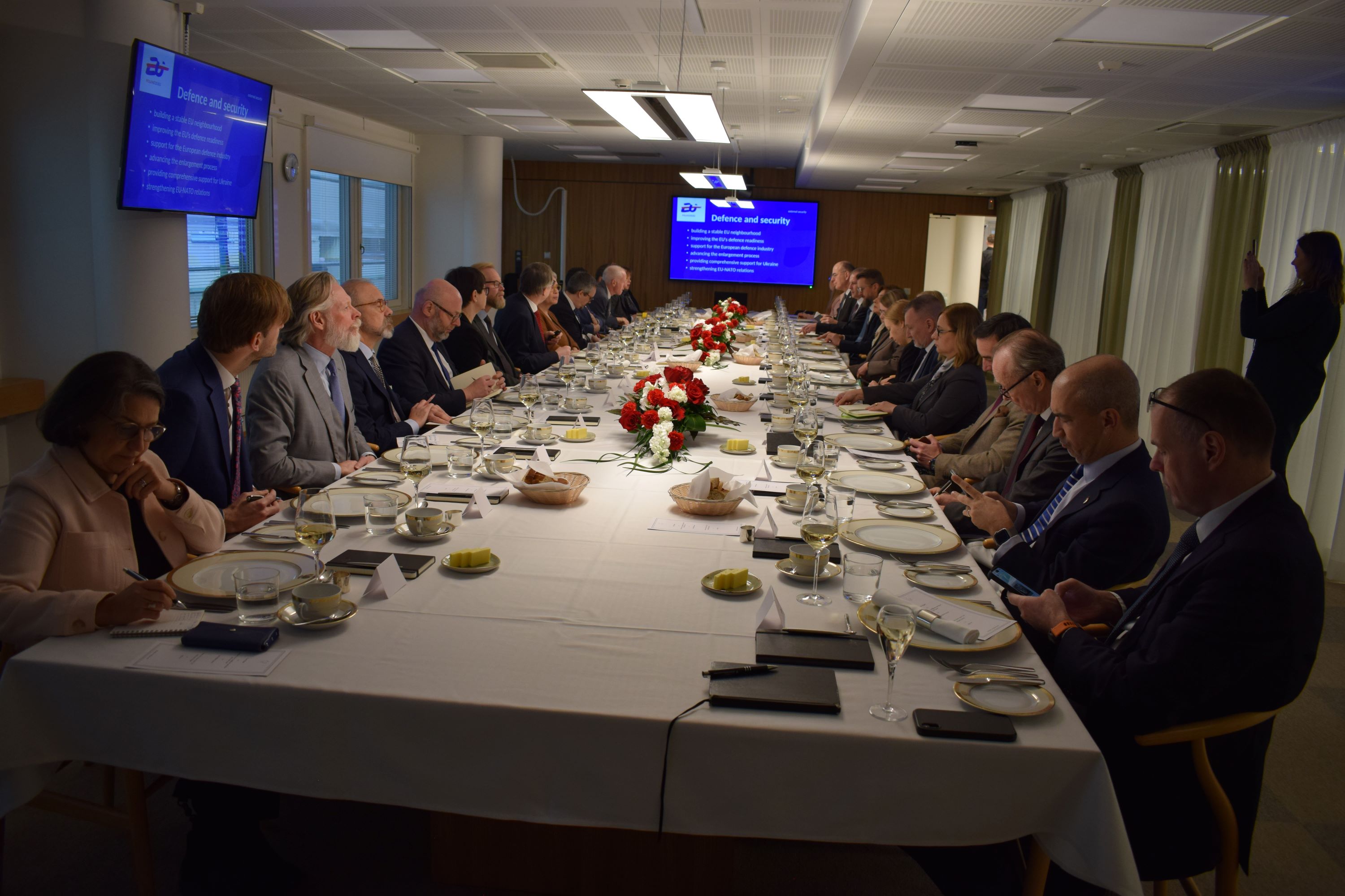 Ministeri Radosław Sikorski lähetti äänitetyt terveiset Elina Valtoselle ja lounaan osallistujille tilaisuuden alussa. Suurlähettiläs Tomasz Chłoń esitteli EU-neuvoston Puolan puheenjohtajuuskauden painopisteitä jonka jälkeen hän käynnisti edustuston päälliköiden ja ministeri Valtosen välisen keskustelun Euroopan ajankohtaisesta politiikasta, turvallisuudesta ja transatlanttisista suhteista.