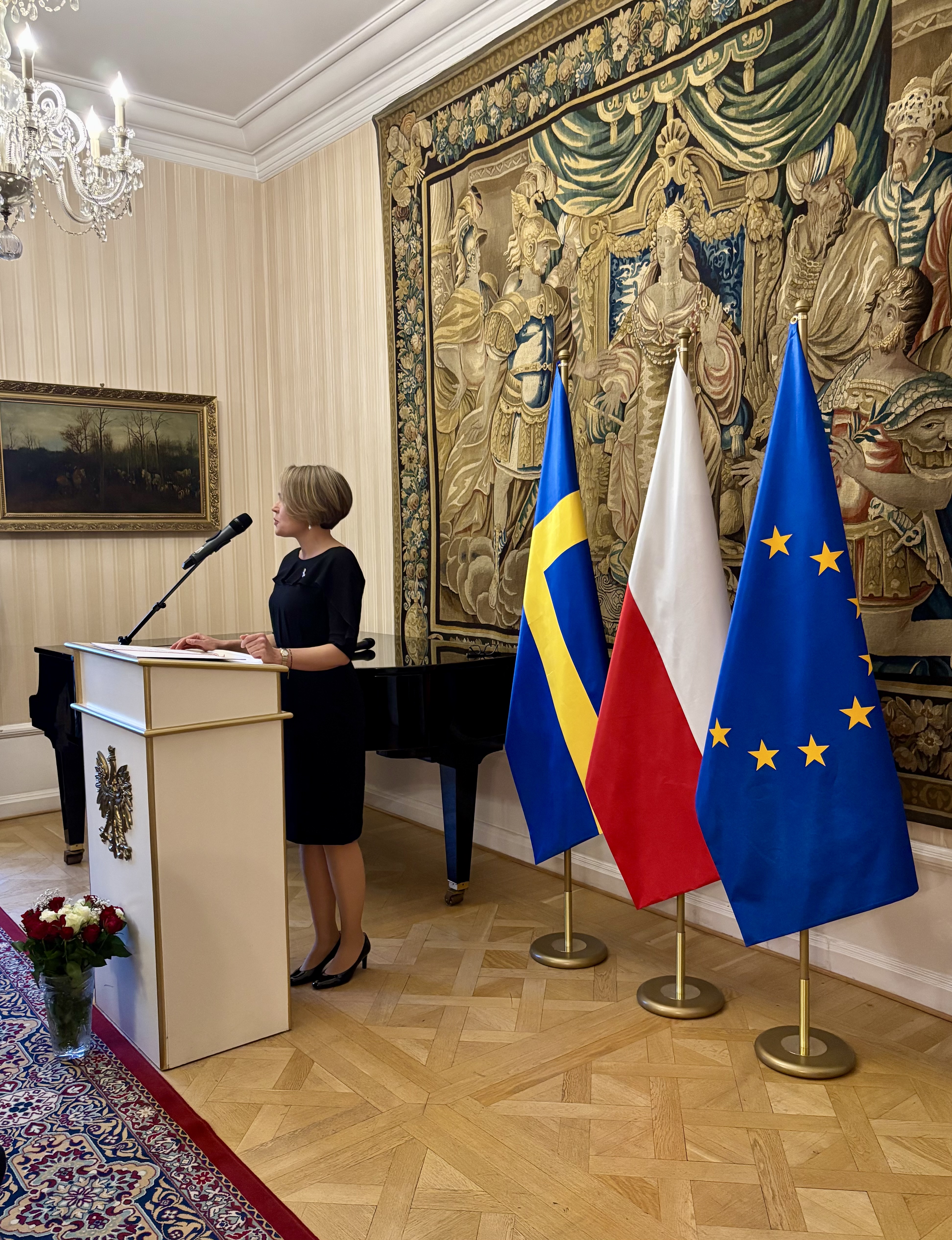 The ceremony began with a joint singing of the Polish national anthem, Mazurek Dąbrowskiego, followed by remarks delivered by the Ambassador Extraordinary and Plenipotentiary of the Republic of Poland to the Kingdom of Sweden, Ms Karolina Ostrzyniewska.