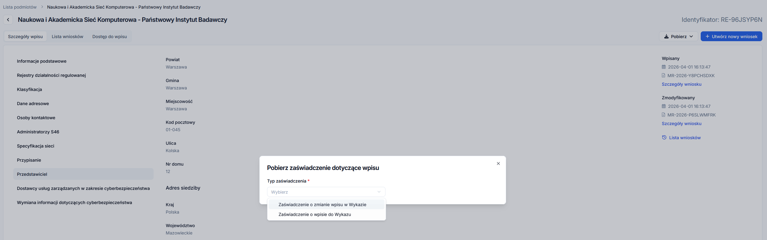 – „Zaświadczenie o modyfikacji wpisu do wykazu” – zawiera tylko dane zmienione w ramach wybranego wniosku o zmianę wpisu. - Kliknij „Pobierz” Plik PDF zostanie zapisany na twoim dysku zgodnie z ustawieniami przeglądarki.