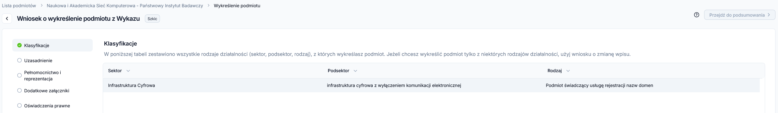 - W formularzu przejrzyj sektory i rodzaje działalności objęte wnioskiem oraz wpisz uzasadnienie wykreślenia.