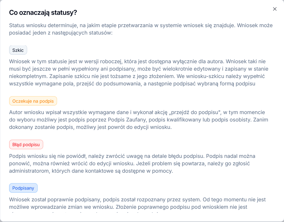 Każdy wniosek ma przypisany status informujący o etapie jego realizacji. Aby dowiedzieć się, co oznaczają poszczególne statusy wniosku, kliknij na status wniosku w aplikacji.