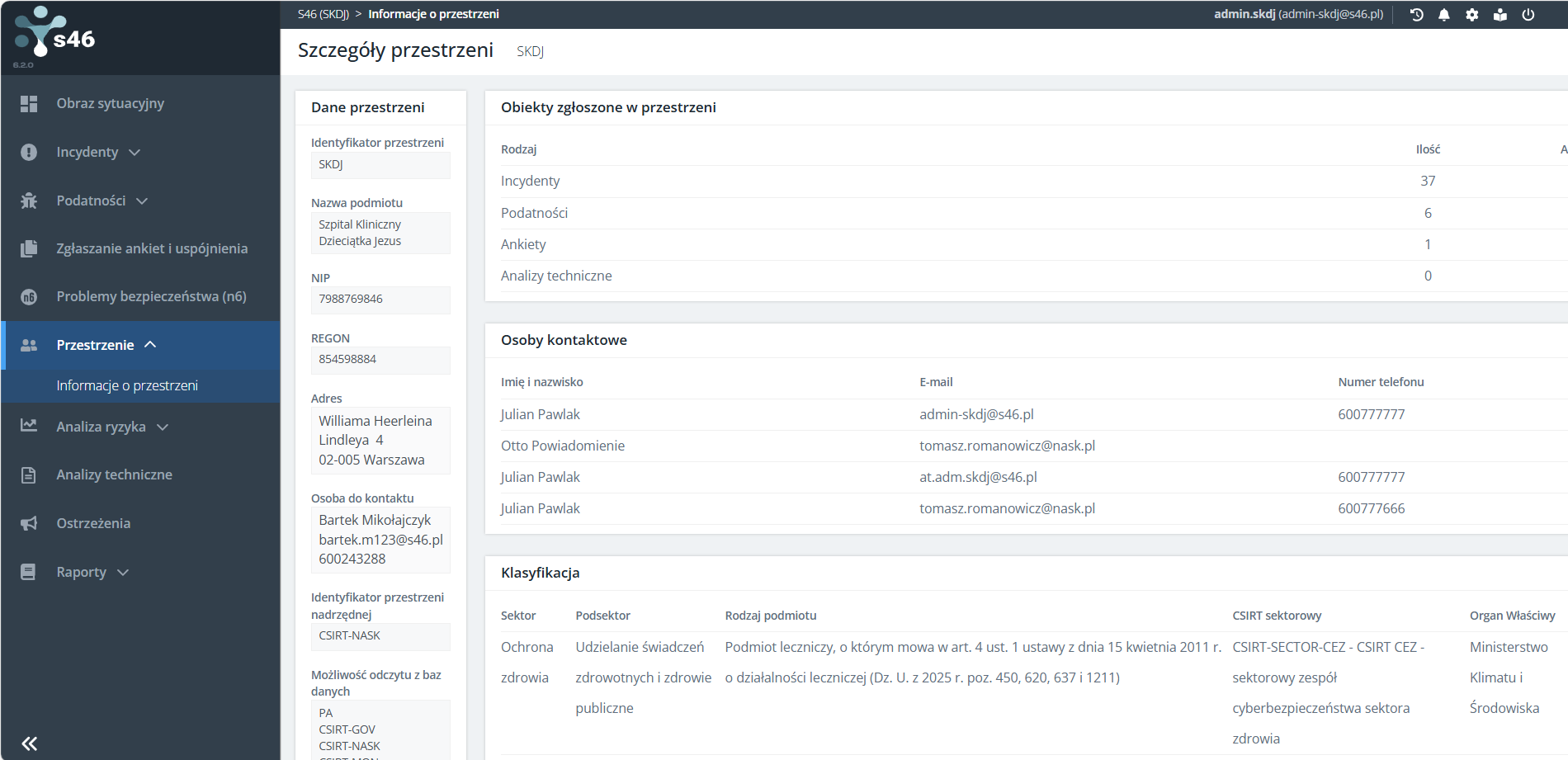 W przypadku wykrycia niezgodności w danych podmiotu umieszczonych w widoku „Szczegóły przestrzeni”, prosimy o zgłoszenie na adres s46-admin@nask.pl w celu aktualizacji konfiguracji.