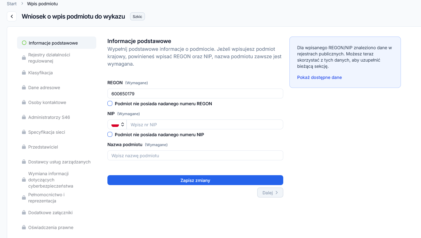 Jeżeli wpiszesz NIP lub REGON, aplikacja automatycznie zaproponuje ci uzupełnienie odpowiednich pól na podstawie tych danych. Podpowiedź pojawi się przy każdej odpowiedniej sekcji.