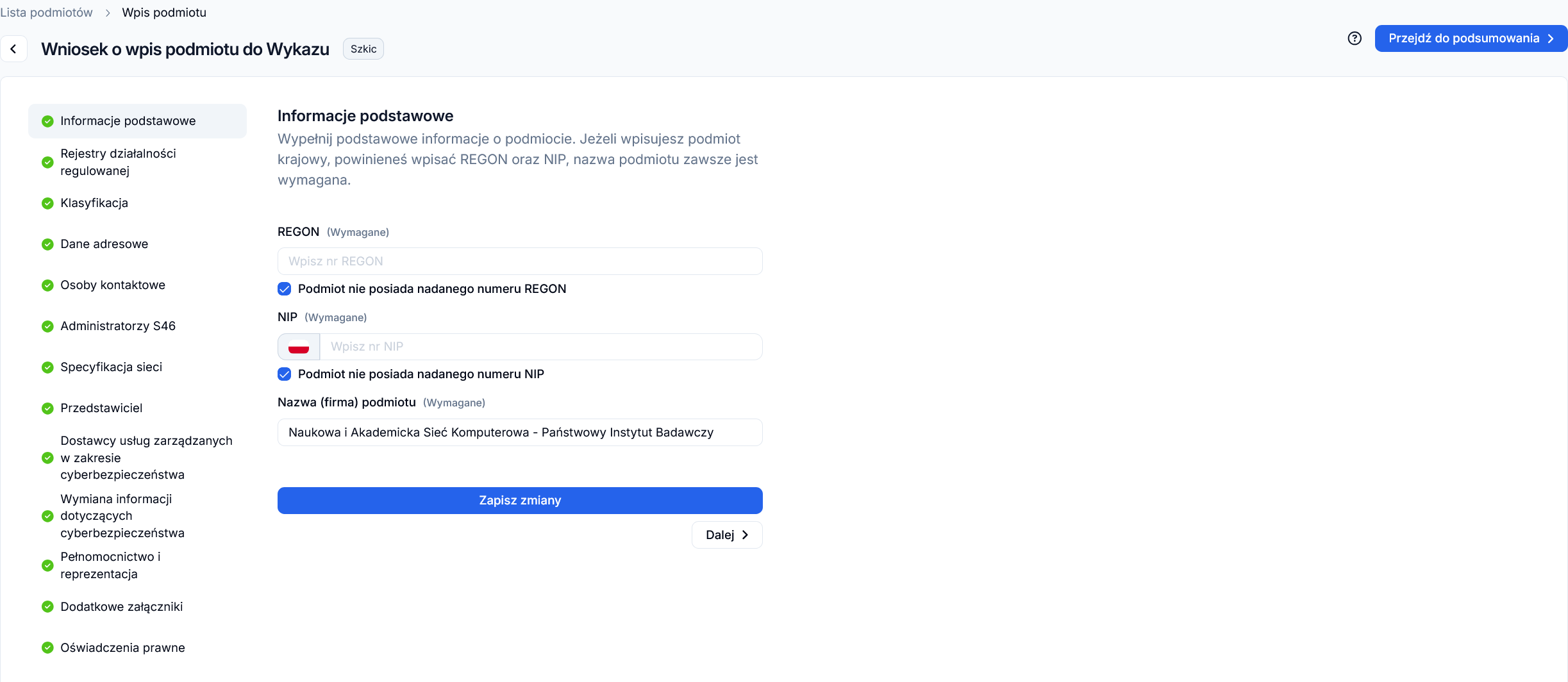 - Po zapisaniu ostatniej sekcji kliknij „Przejdź do posumowania”.