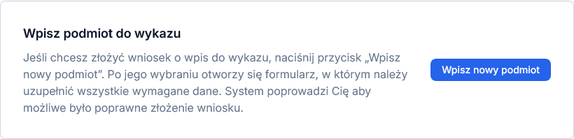 Na stronie powitalnej kliknij „Wpisz nowy podmiot”. System wyświetli formularz wniosku o wpis do wykazu.