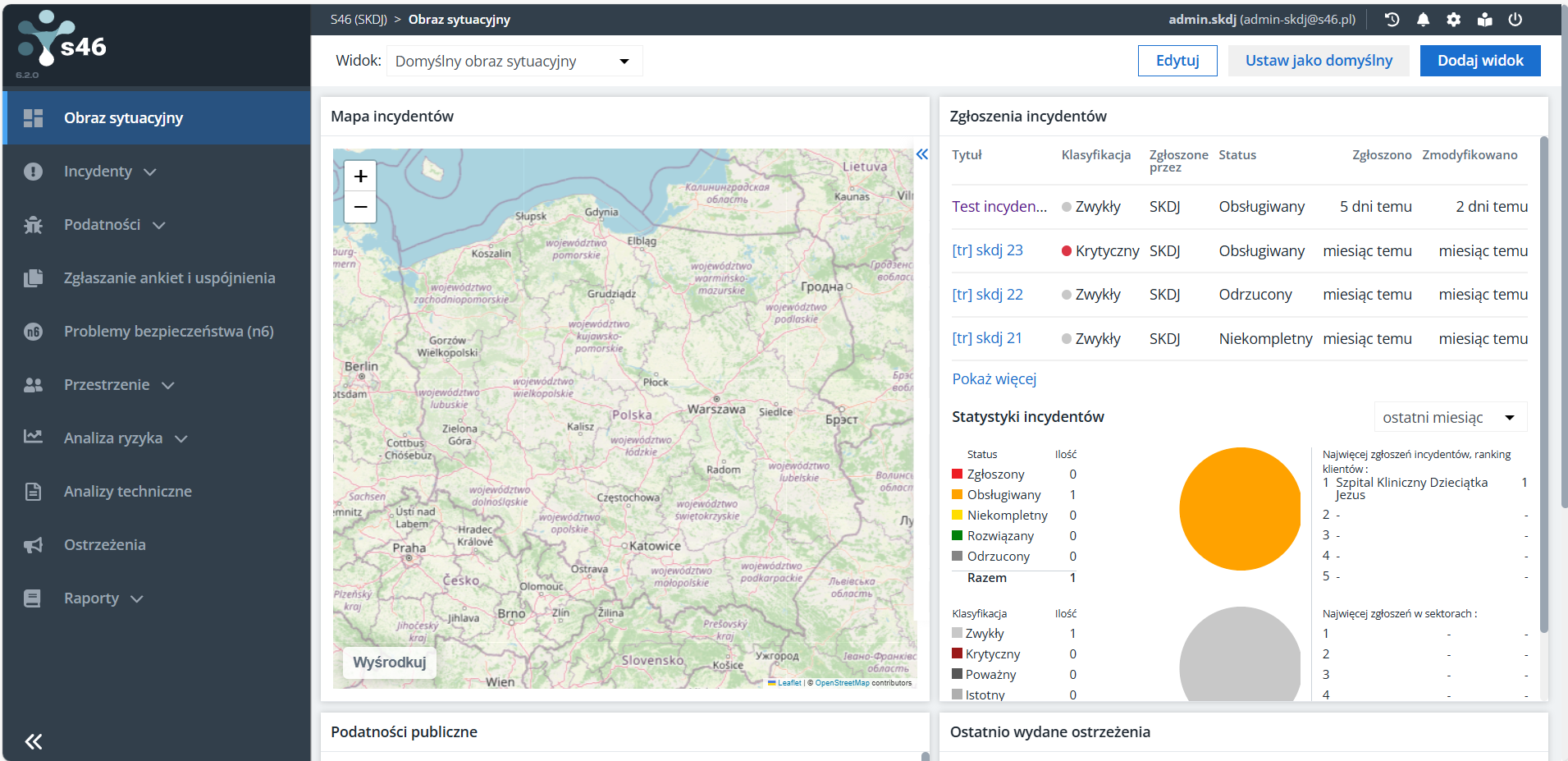 Poniższy obrazek przedstawia zrzut z ekranu Systemu S46 w widoku „Obraz sytuacyjny”, który jest prezentowany po zalogowaniu. Obraz sytuacyjny to dashoard ze zbiorem widgetów, w których prezentowane są informacje pochodzące z innych funkcji aplikacji. Domyślnie są to widgety: Mapa incydentów, Zgłoszenia incydentów, Podatności publiczne i Ostatnio wydane ostrzeżenia. Zestaw i układ widgetów może być edytowany przez administratora przestrzeni. Ten centralny widok ekranu będzie się zmieniać wraz z wyborem różnych funkcji aplikacji.