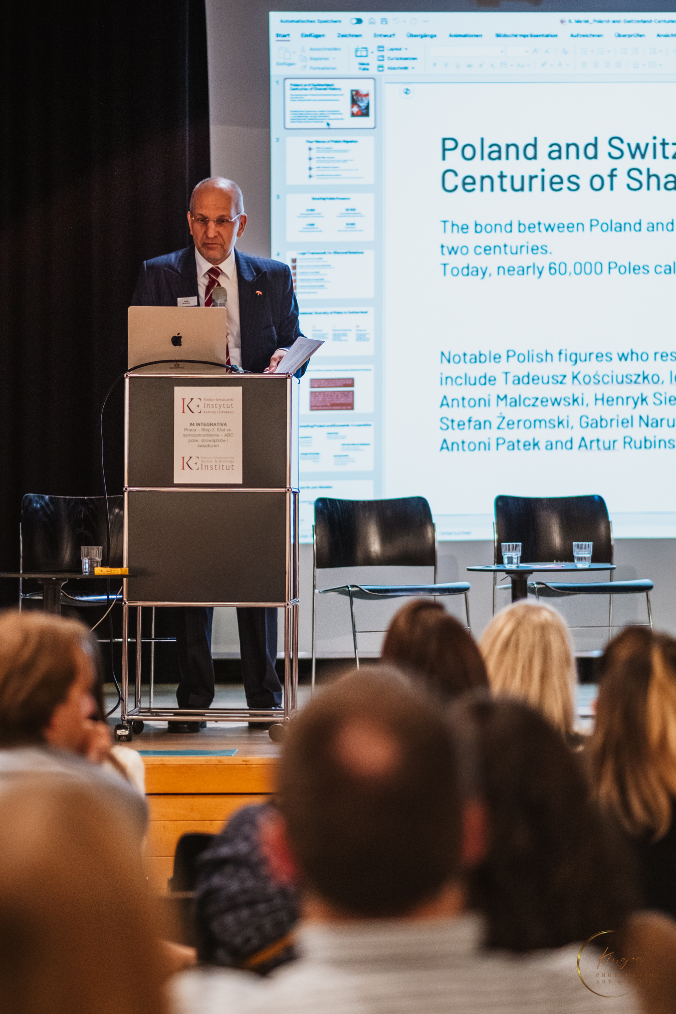 Jednym z zaproszonych panelistów był Marek Minarczuk, chargé d’affaires RP w Szwajcarii, który przedstawił dane na temat Polaków w Szwajcarii – ich liczby, rozmieszczenia w kantonach oraz najczęściej wykonywanych zawodów. Omówił także działania podejmowane przez Polskę w celu wzmocnienia współpracy ze Szwajcarią, przedstawił instytucje wspierające Polaków oraz wskazał, gdzie można szukać pomocy w kwestiach związanych z pracą i integracją zawodową.