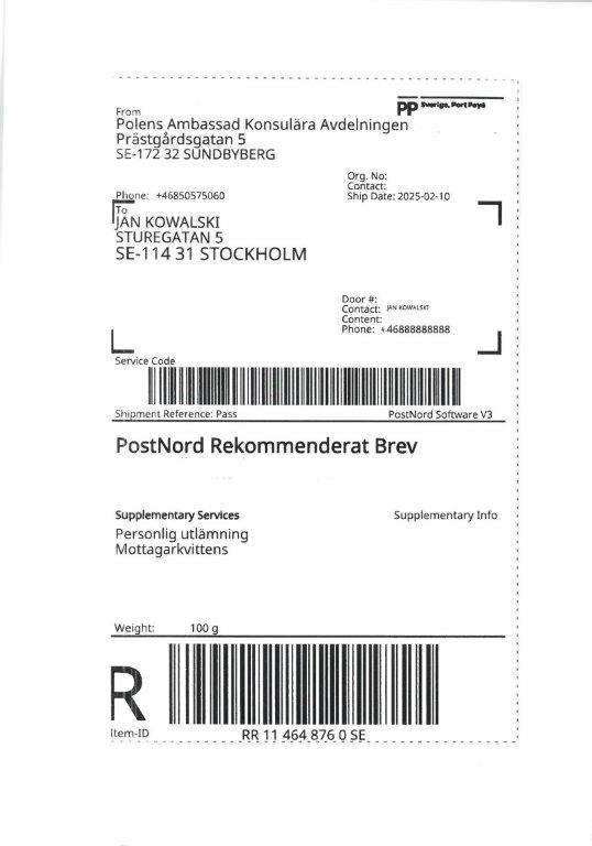 Konsul w Sztokholmie nie wysyła paszportów do obywateli przebywających poza Szwecją.