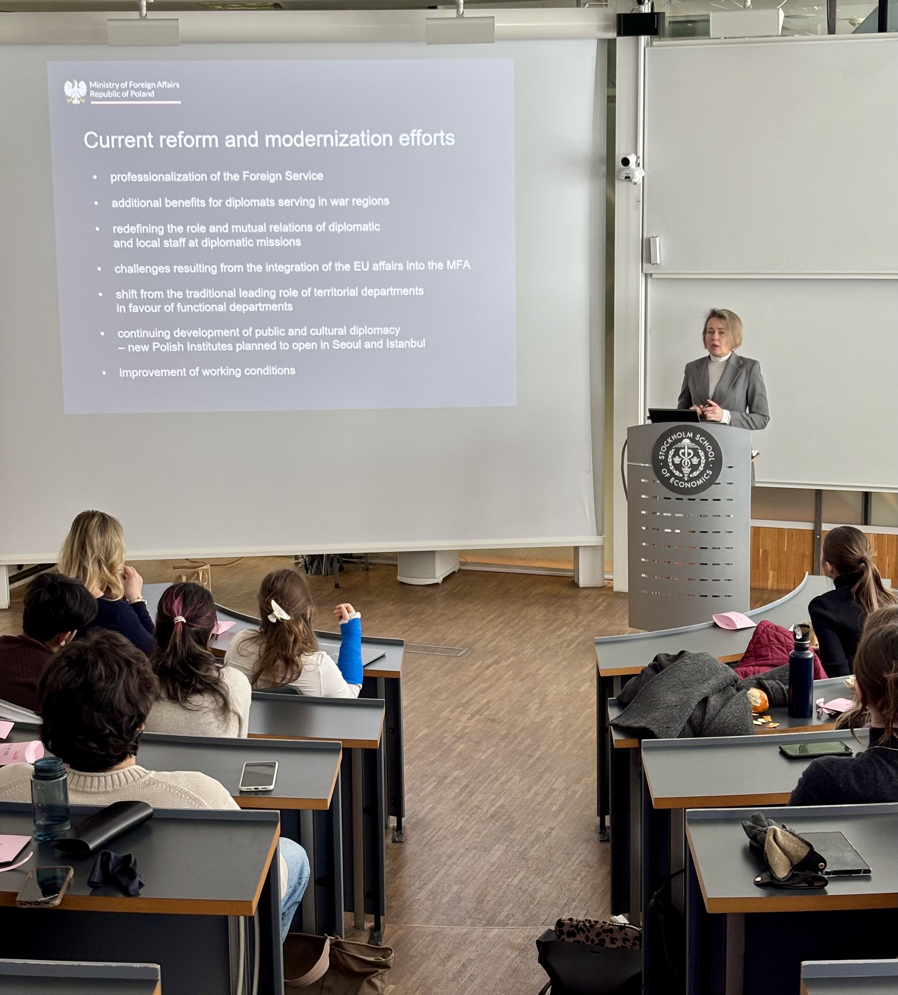 25 lutego br. Ambasador Karolina Ostrzyniewska odwiedziła Wyższą Szkołę Handlową w Sztokholmie (Handelshögskolan), aby spotkać się ze studentami zainteresowanymi tematyką pracy w dyplomacji oraz bieżącymi relacjami bilateralnymi między Polską a Szwecją. Spotkanie w formule wykładu lunchowego zgromadziło blisko 50 uczestników reprezentujących różne kierunki studiów na WSH. Wydarzenie zostało zorganizowane w ramach Tygodnia Międzynarodowego (23-27 lutego) na zaproszenie stowarzyszenia studenckiego SASSE.