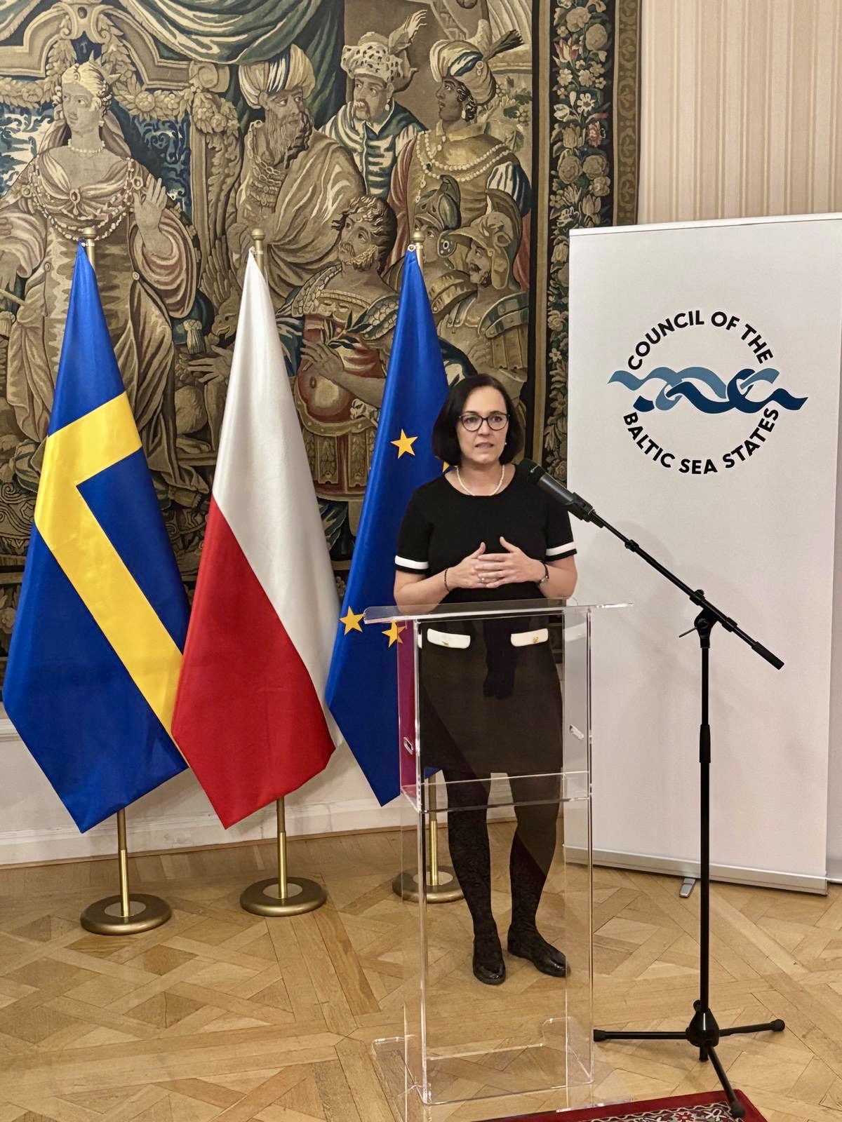 W dniu 19 listopada 2025 r. Ambasador Karolina Ostrzyniewska wzięła udział w seminarium zorganizowanym przez Sekretariat Rady Państw Morza Bałtyckiego (CBSS) w Sztokholmie oraz polską prezydencję w RPMB poświęconym wzmocnieniu bezpieczeństwa w regionie Morza Bałtyckiego. W wydarzeniu uczestniczyli przedstawiciele państw członkowskich Rady (na szczeblu Komitetu Wyższych Urzędników, z MSZ PL Pani Katarzyna Barcikowska, przewodnicząca) oraz państw obserwatorów, przedstawiciele instytucji UE, dyplomaci, a także eksperci zajmujący się bezpieczeństwem morskim i ochroną infrastruktury krytycznej.
