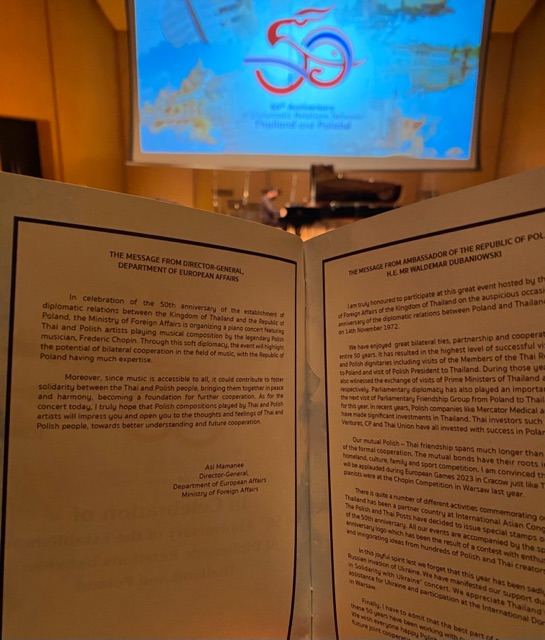 26 września odbył się uroczysty koncert w wykonaniu polskich i tajskich artystów w celu uczczenia 50. rocznicy nawiązania stosunków dyplomatycznych pomiędzy Polską i Tajlandią. Koncert miał miejsce w sali koncertowej jednego z najbardziej renomowanych tajlandzkich uczelni, Uniwersytetu Mahidol.
