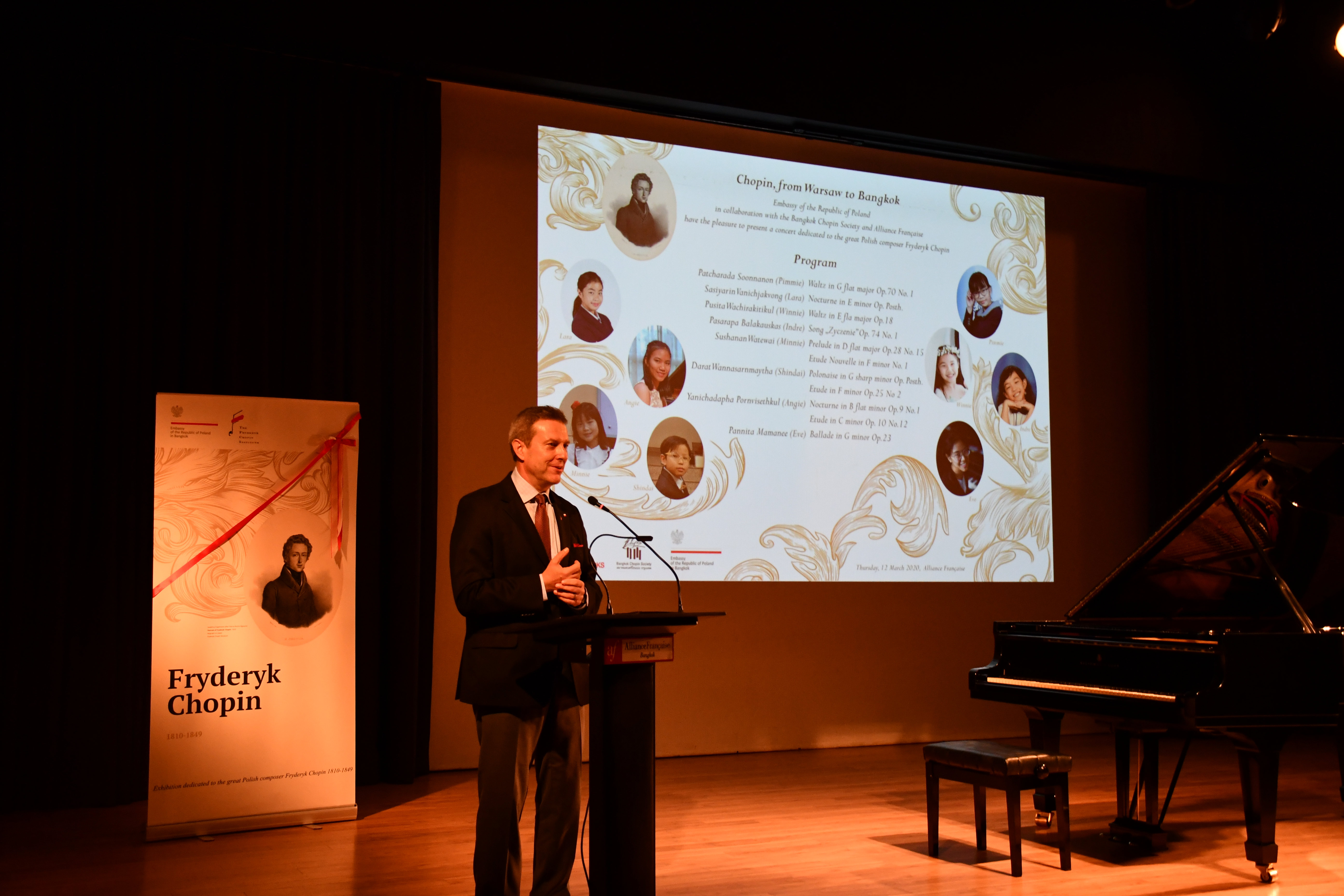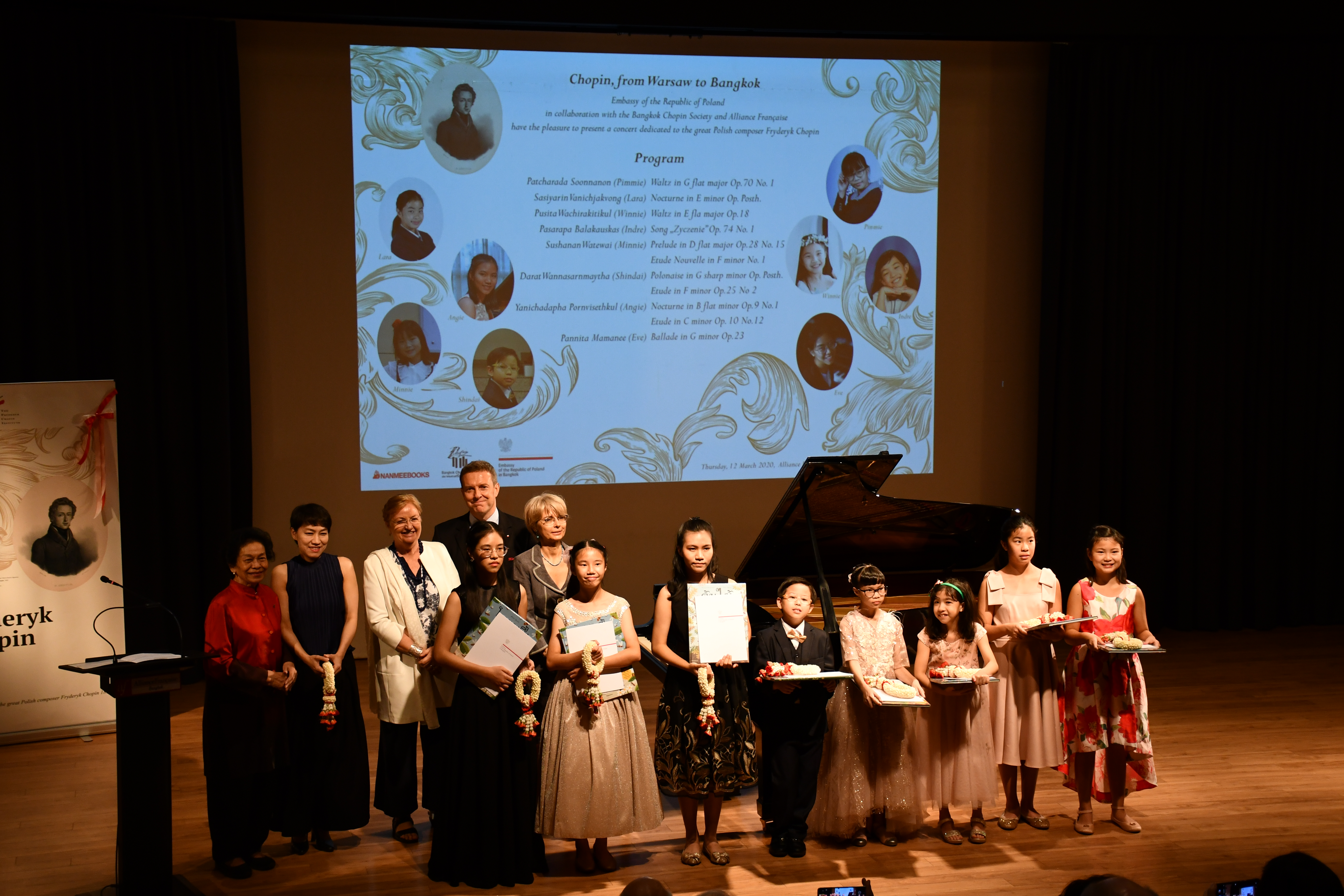 Wspaniałe interpretacje kompozycji Chopina w wykonaniu utalentowanej tajskiej młodzieży Pimmie, Lara, Winnie, Indre, Minnie, Shindai, Angie i Eve zostały świetnie przyjęte przez licznie przybyłą publiczność. Koncert był częścią uroczystych obchodów 210 rocznicy urodzin polskiego kompozytora i pianisty, Fryderyka Chopina. W związku z tym liczna tajska i międzynarodowa publiczność była również proszona o głośne wypowiedzenie miejsca urodzenia Chopina - „Żelazowa Wola”. Zgromadzonych przywitali Ambasador Waldemar Dubaniowski, Dyrektorka Alliance Française Pascale Fabre i Przewodnicząca Stowarzyszenia Chopinowskiego Lucia Menchavez Thangsuphanich. Młodzi soliści otrzymali pamiątkowe dyplomy i wspaniałe polskie książki „Drzewa” i „Pszczoły” (w języku tajskim) z rąk Ambasadora i małżonki Ewy Dubaniowskiej. Polskie bestsellery literatury młodzieżowej zasponsorowało tajskie wydawnictwo Nanmeebooks. Świetna wystawa poświęcona nadzwyczajnemu życiu i twórczości Chopina otwarta podczas uroczystości będzie dostępna w Alliance Française do końca marca. Po koncercie odbył się poczęstunek.