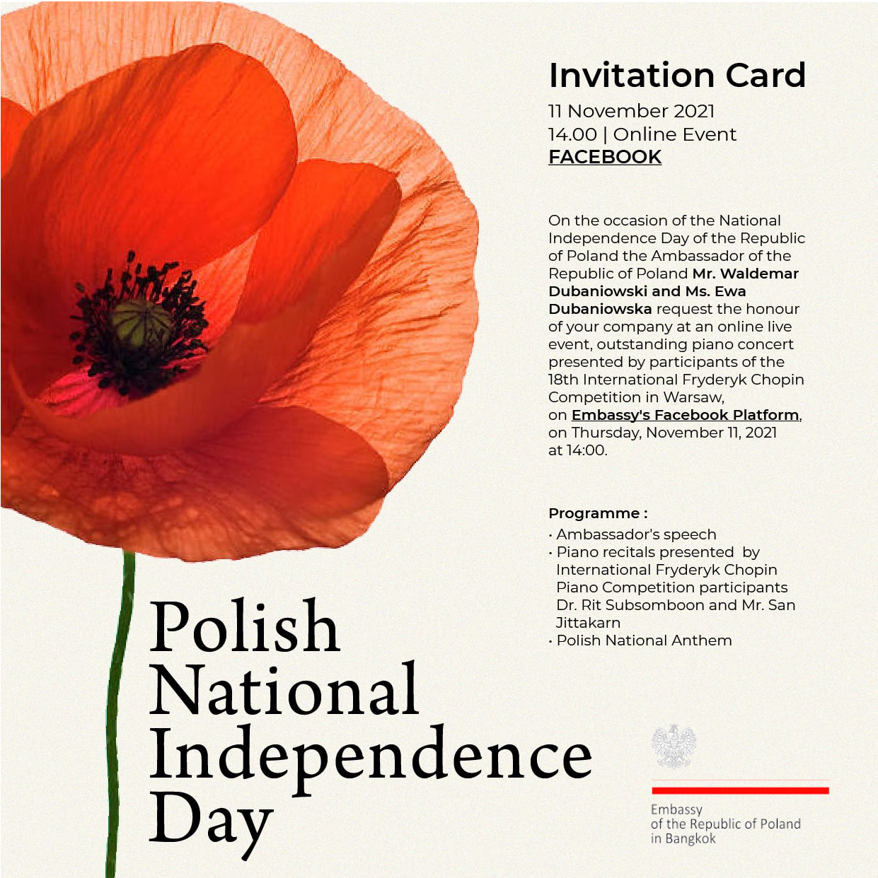 Z okazji 103. rocznicy odzyskania przez Polskę niepodległości, zapraszamy na niezwykły polski koncert on-line w wykonaniu wybitnych tajskich pianistów młodego pokolenia.