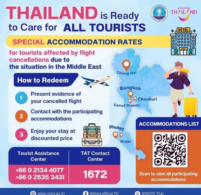 2. W odniesieniu do pojawiających się w mediach informacji o wsparciu przez władze tajskie turystów, którzy musieli przymusowo pozostać w Tajlandii, informujemy, że w dniu 11 marca 2026 r. została opublikowana lista hoteli, które udzielają schronienia po preferencyjnych cenach. Szczegóły można uzyskać skanując kod QR z poniższej grafiki lub klikając link do pliku PDF na samym dole strony. Należy mieć ze sobą potwierdzenie anulacji lotu.
