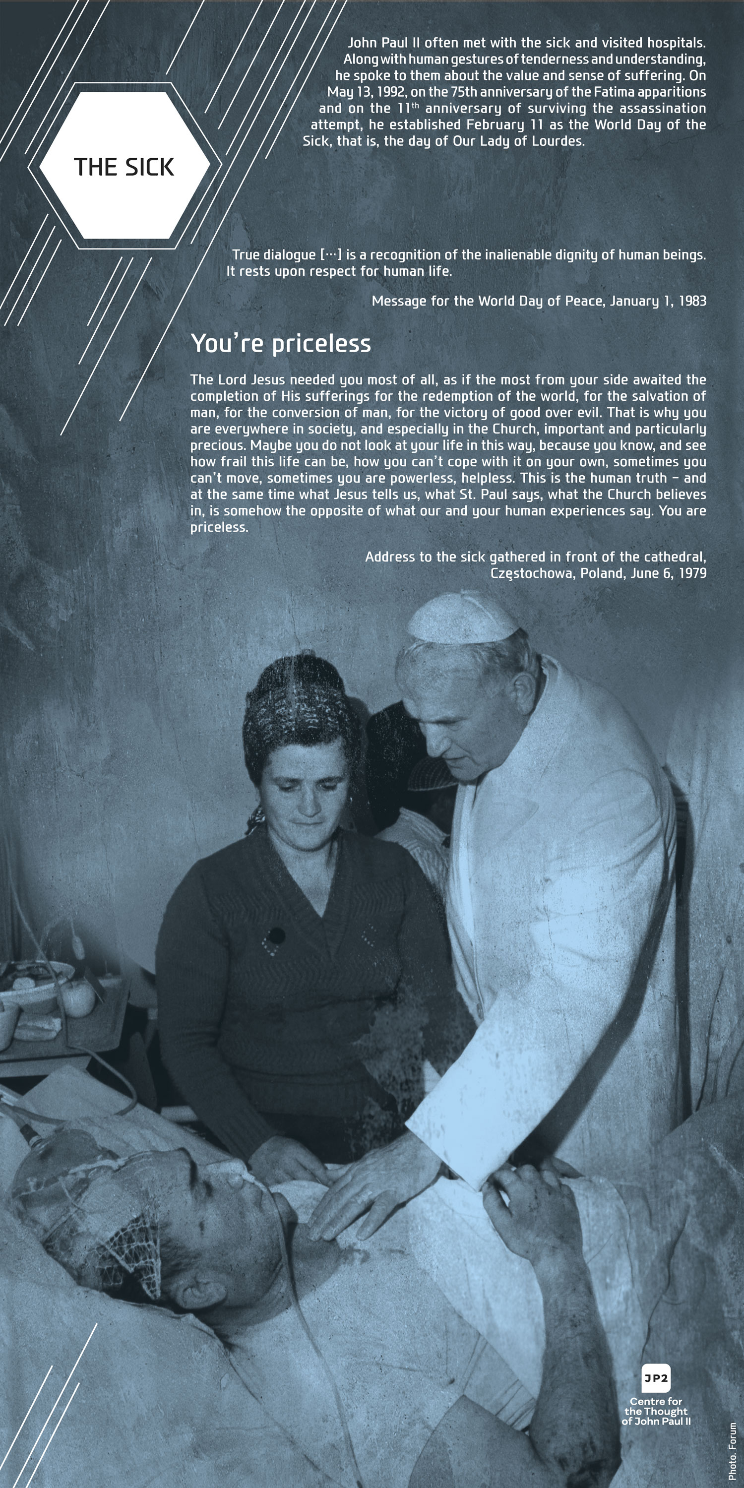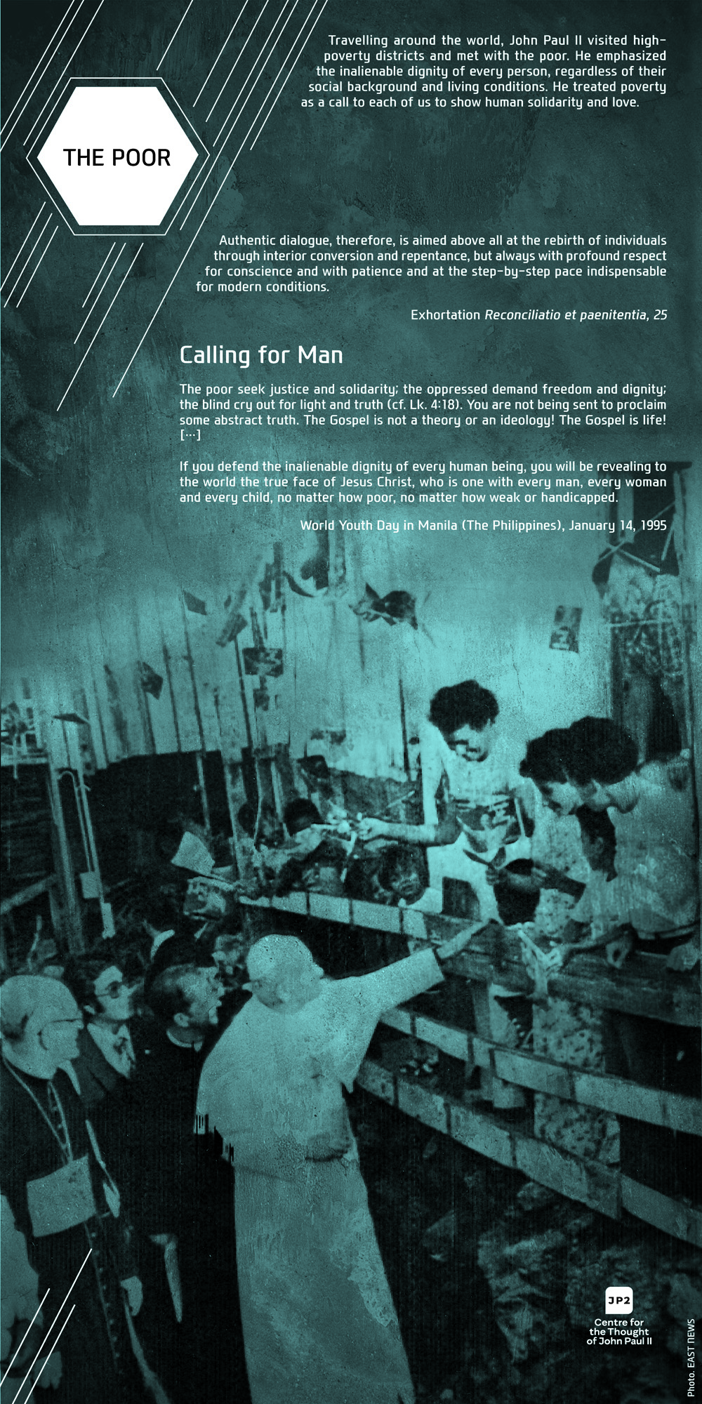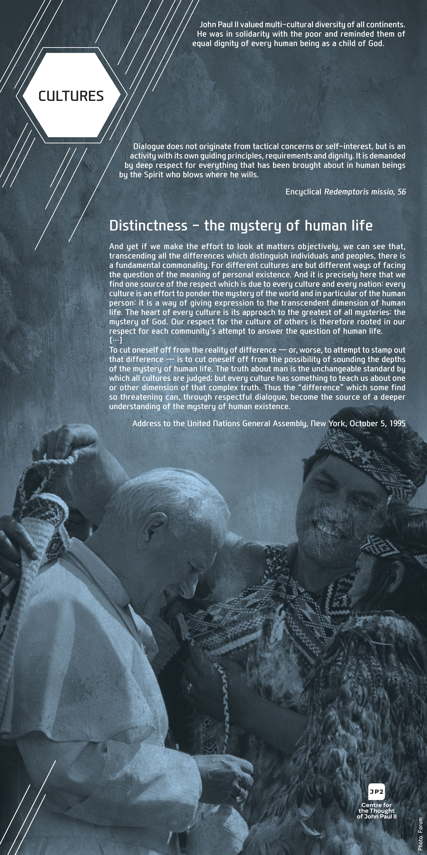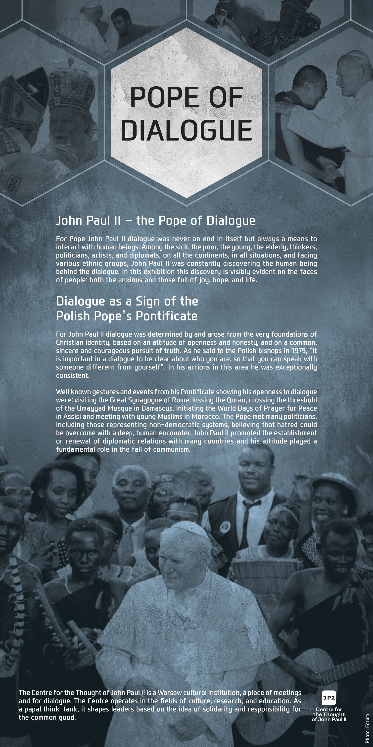 For Pope John Paul II dialogue was never an end in itself but always a means to interact with human beings. Among the sick, the poor, the young, the elderly, thinkers, politicians, artists, and diplomats, on all the continents, in all the situations, and facing various ethnical groups, John Paul II was constantly discovering the human being behind the dialogue. In our exhibition this discovery is visibly evident on the faces of people: both the anxious and those full of joy, hope, and life.