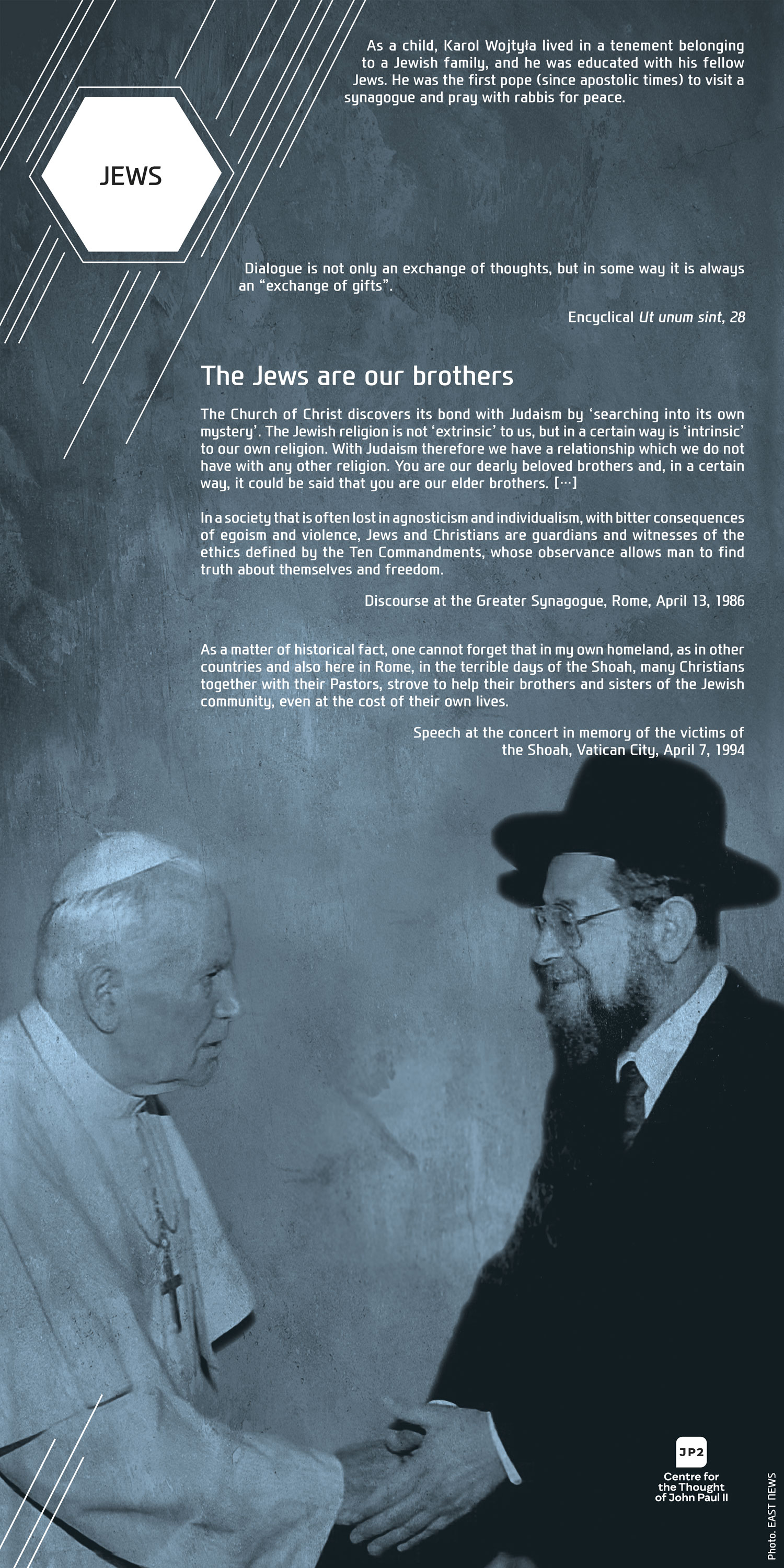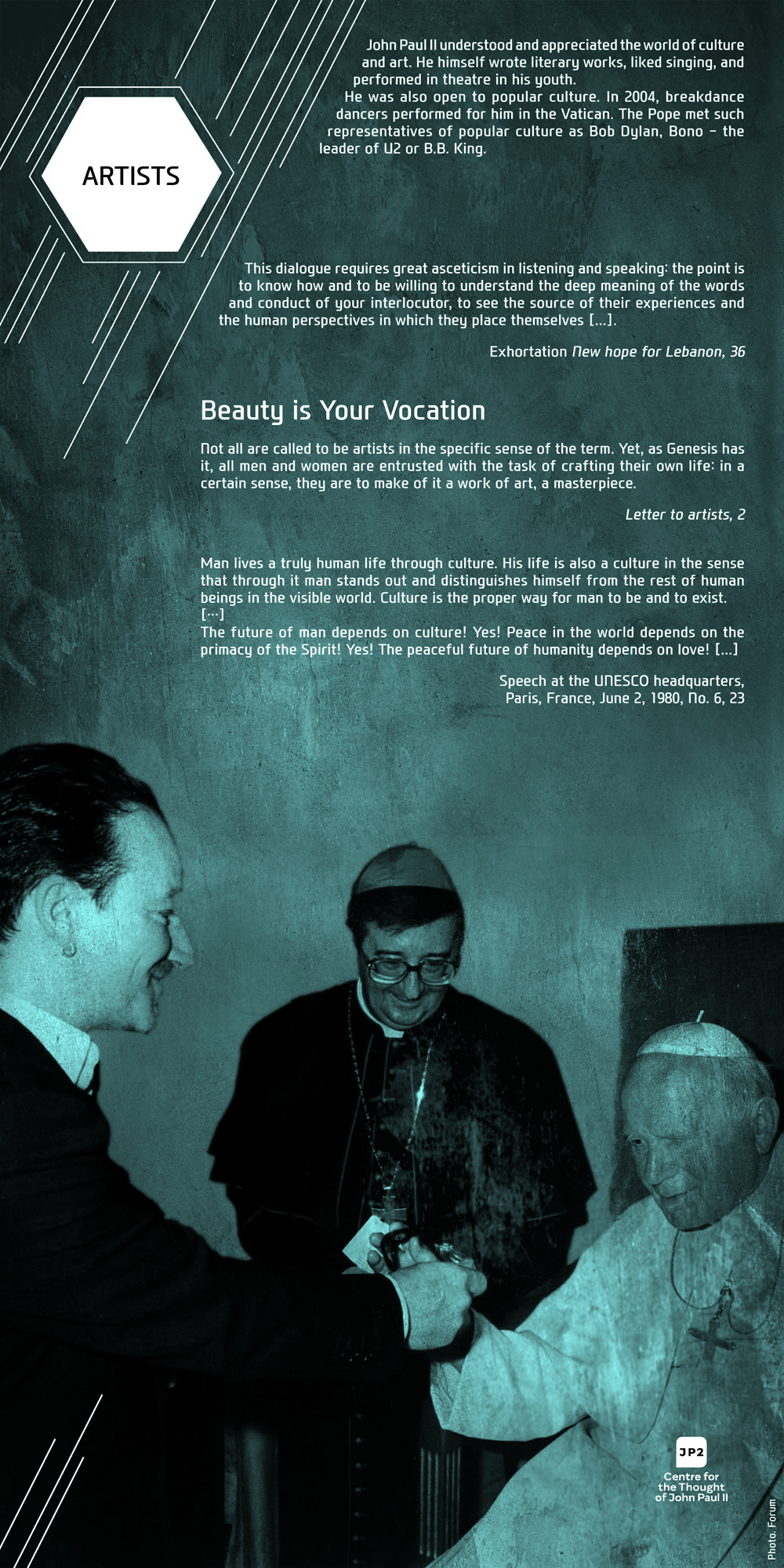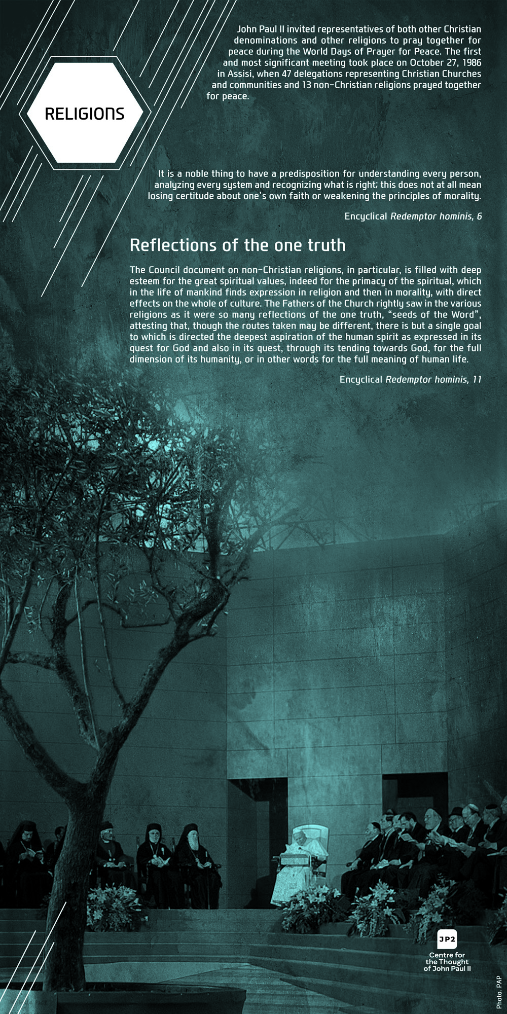 For Pope John Paul II dialogue was never an end in itself but always a means to interact with human beings. Among the sick, the poor, the young, the elderly, thinkers, politicians, artists, and diplomats, on all the continents, in all the situations, and facing various ethnical groups, John Paul II was constantly discovering the human being behind the dialogue. In our exhibition this discovery is visibly evident on the faces of people: both the anxious and those full of joy, hope, and life.