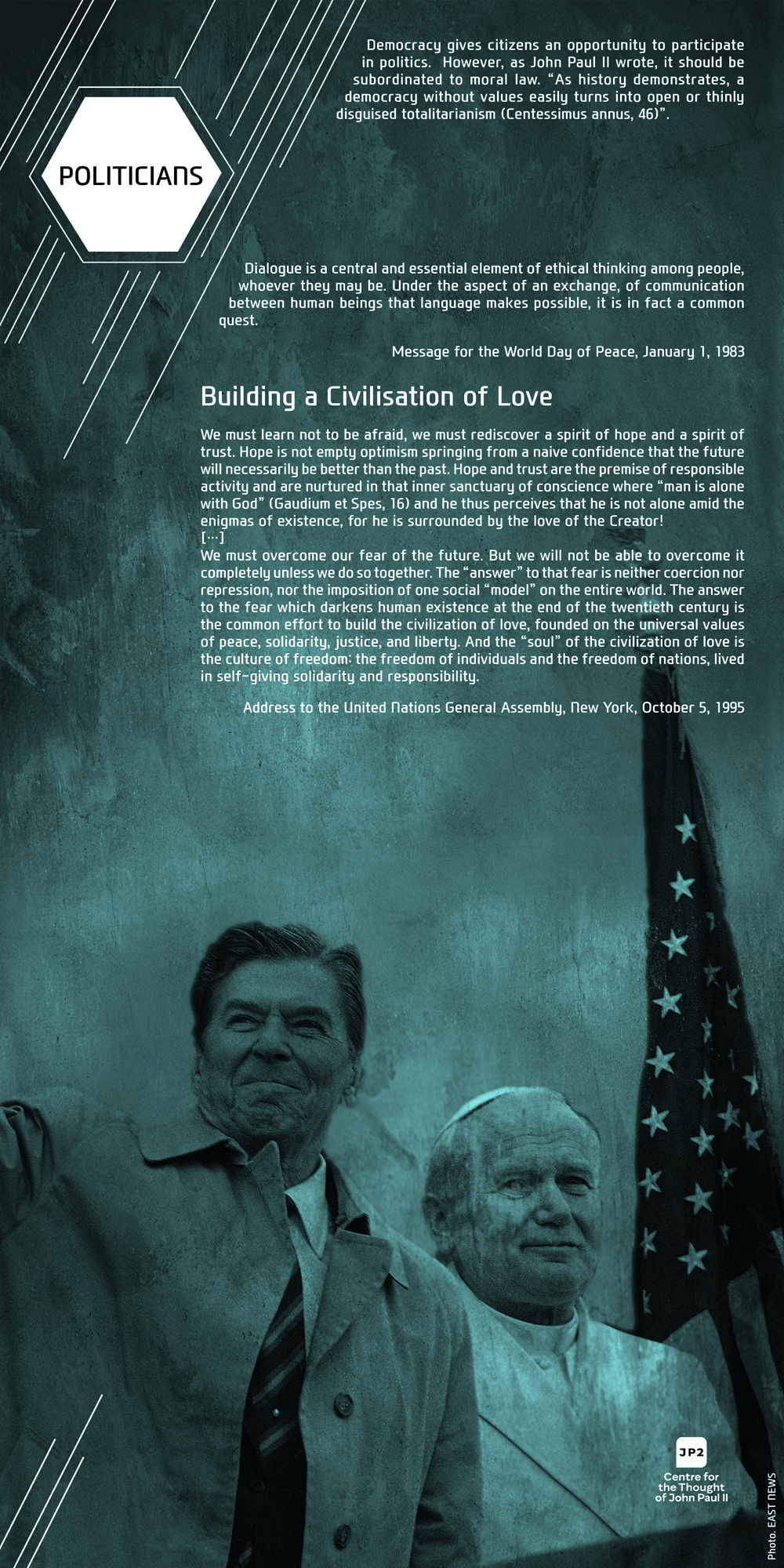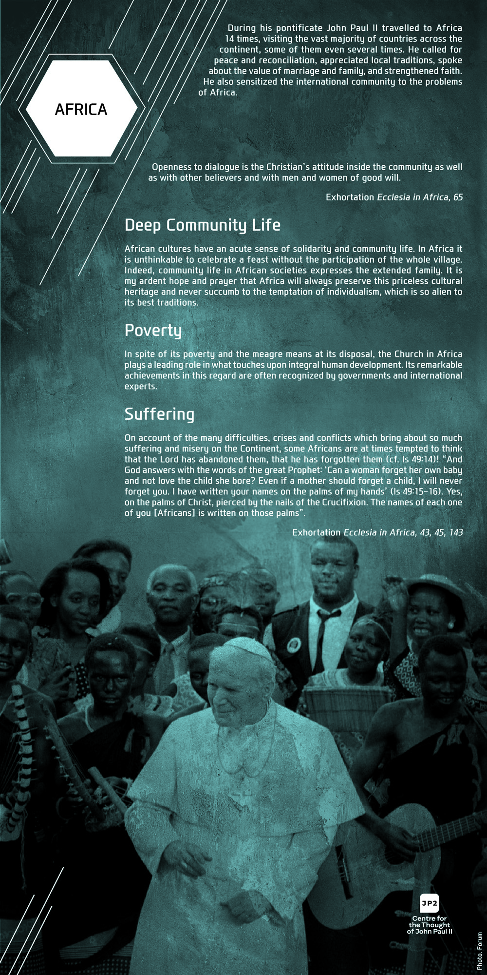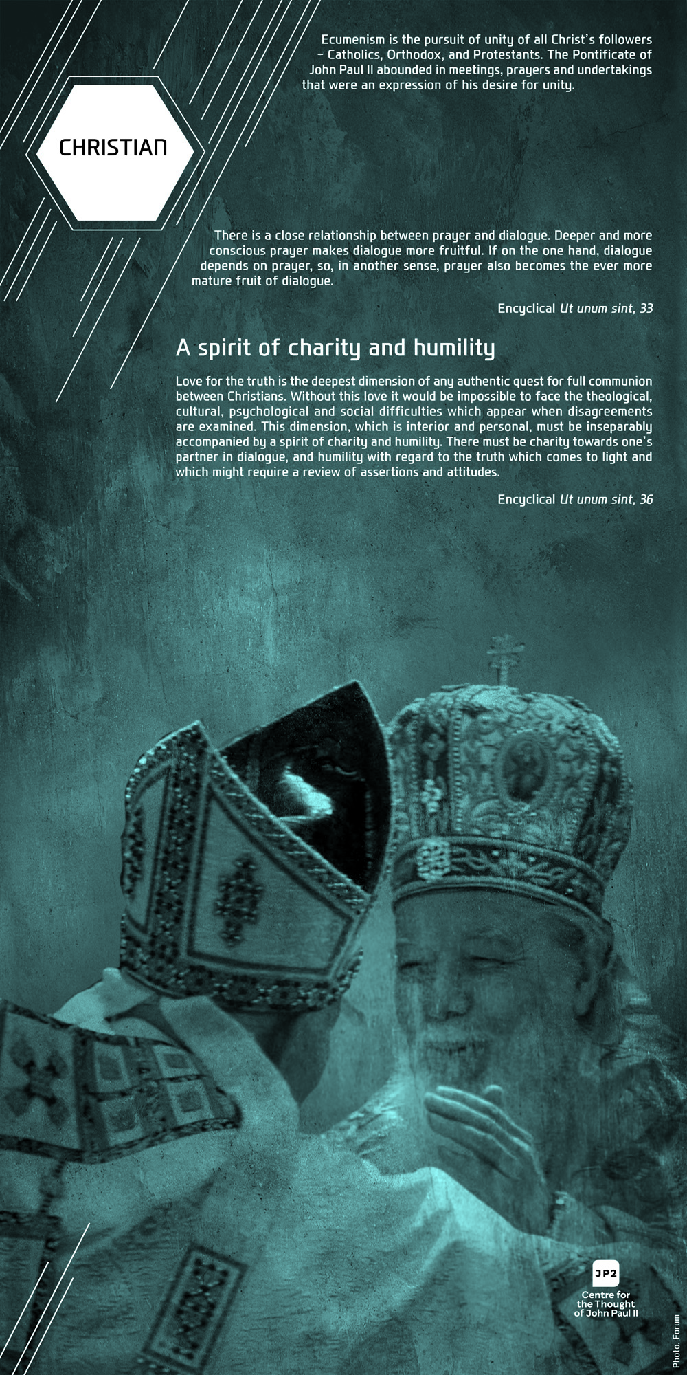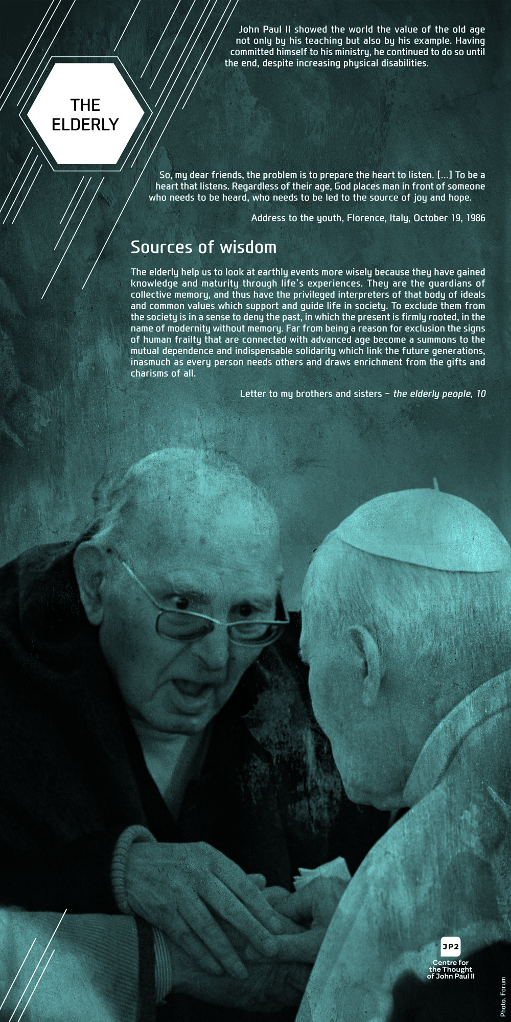 For Pope John Paul II dialogue was never an end in itself but always a means to interact with human beings. Among the sick, the poor, the young, the elderly, thinkers, politicians, artists, and diplomats, on all the continents, in all the situations, and facing various ethnical groups, John Paul II was constantly discovering the human being behind the dialogue. In our exhibition this discovery is visibly evident on the faces of people: both the anxious and those full of joy, hope, and life.
