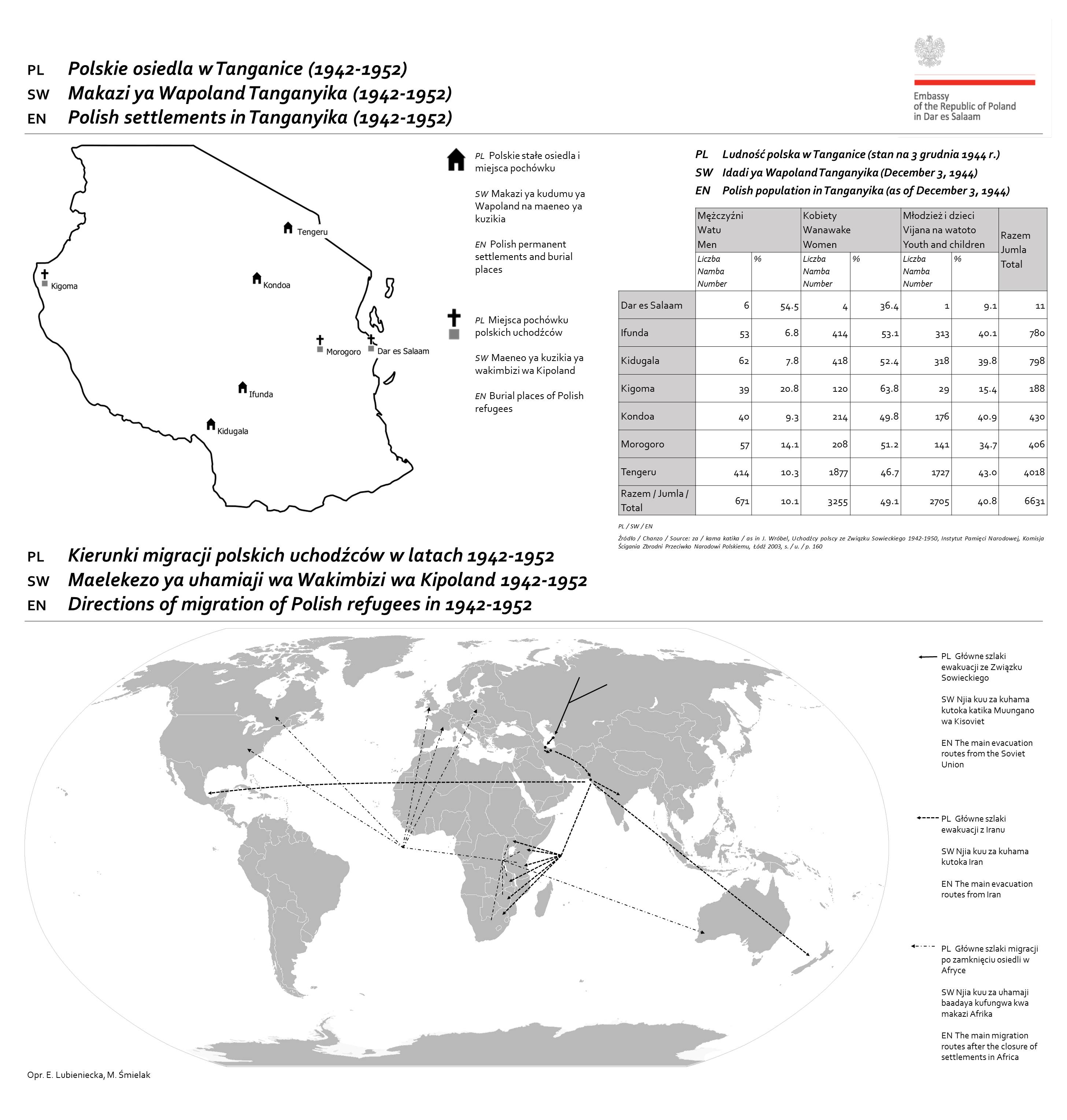 Nafasi ya wakimbizi wa Kipolandi kuondoka kutoka Iran kwenda Afrika ilikuwa kubwa. Mwishoni mwa 1944 kulikuwa na raia wa Poland 13,364 katika nchi tatu za Afrika mashariki, ambapo 6,331 walikuwa Tanganyika. Mategemeo ya kumalizika kwa vita yalifanya uhamaji kusitishwa. Katika Afrika Mashariki yalianzishwa makazi sita ya kudumu ya wakimbizi wa Kipoland. Manne yalikuwa Tanganyika (Tengeru, Kondoa, Ifunda na Kidugala) na mawili yalikuwa Uganda (Masindi na Koja) mbali na makazi ya kudumu, yalianzishwa makambi kadhaa, ikiwemo katika Morogoro, Kigoma, Dar es Salaam, Iringa na Tosamaganga katika Tanganyika.