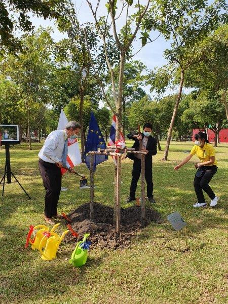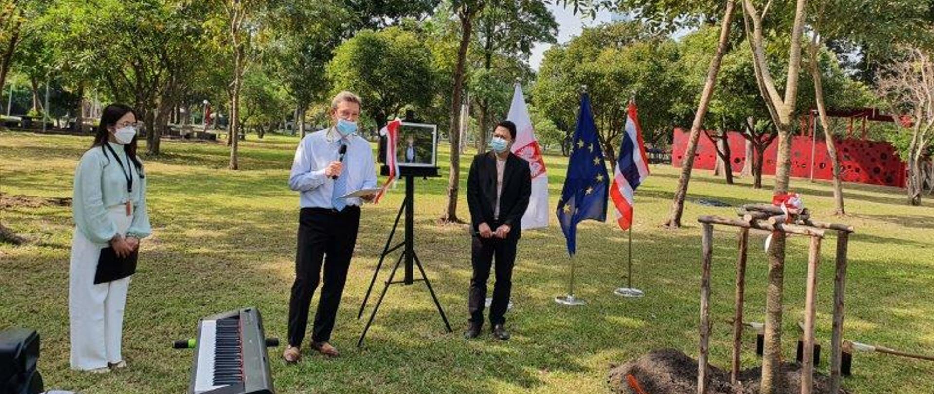 Polish Ambassador Waldemar Dubaniowski and Ms Ewa Dubaniowska accompanied by the Director Wirat Manassanitwong from the BMA’s Environment Department have planted Polish Maestro Krzysztof Penderecki’s Tree in Lumpini Park, the biggest and most famous park in Bangkok