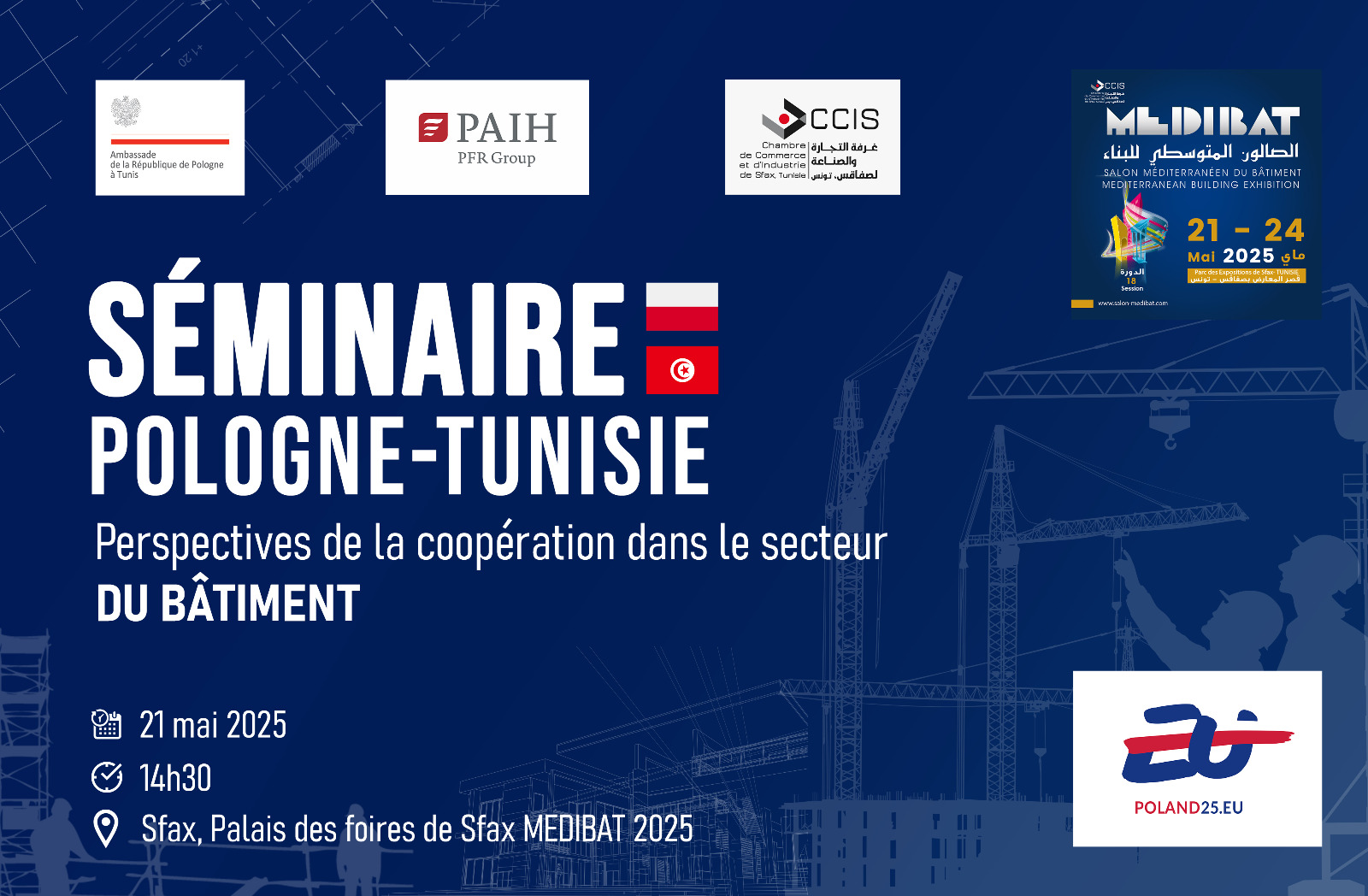 Uprzejmie informujemy, że Ambasada RP w Tunezji, we współpracy z Izbą Przemysłowo-Handlową w Sfaksie oraz Polską Agencją Inwestycji i Handlu (PAIH), organizuje w Sfaksie seminarium pt.:
