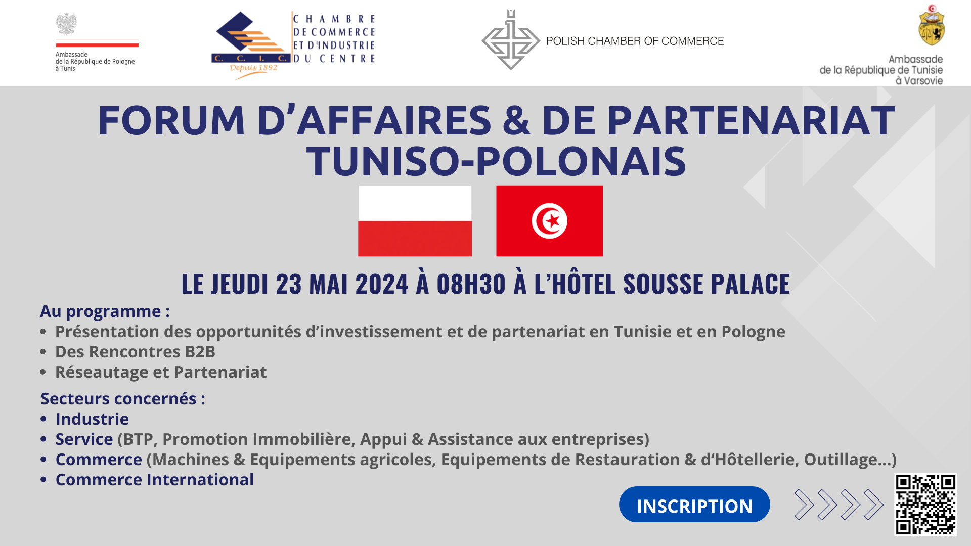 La Chambre de Commerce et d'Industrie du centre organise en collaboration avec la Chambre Polonaise de Commerce Krajowa Izba Gospodarcza et avec l’appui de l’Ambassade de la République de Pologne à Tunis ainsi que Embassy of The Republic of Tunisia in Warsaw