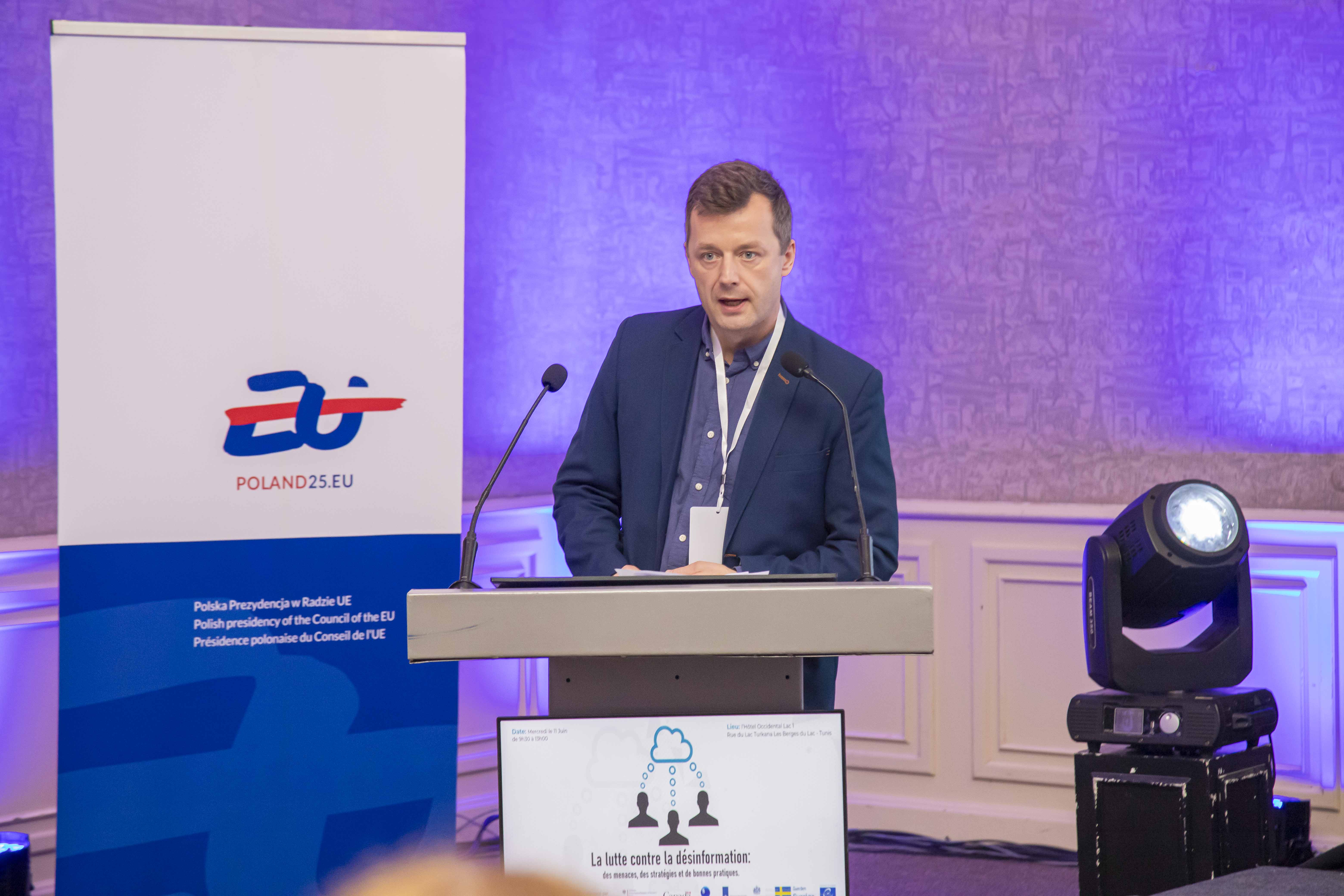 La conférence, modérée par le professeur d’études des médias Sofiene Ammar, comprenait deux panels thématiques. Dans la première, intitulée « External Disinformation Activities Targeting Both State Structures and Individuals » , l’orateur principal était Dr Jędrzej Czerep de l’Institut polonais des affaires internationales, qui a discuté des menaces de désinformation sur le continent africain, provoquant des attitudes anti-occidentales dans les sociétés, mais aussi des conflits au sein d’une nation. Les autres participants à la discussion étaient : Edoardo Oldani du Service européen pour l'action extérieure, Karim Bouzouita - Conseiller pour les médias et la communication, Pilar Morales du Conseil de l'Europe et Ola Svenonius de l'Agence suédoise de recherche sur la défense. Les discours ont porté sur les phénomènes qui menacent la stabilité de l’État, tels que l’ingérence dans les élections ou l’influence des jeunes en ligne, ainsi que sur les mécanismes de lutte contre ces phénomènes au niveau étatique et institutionnel.