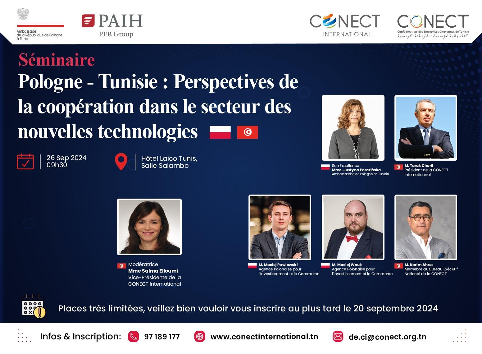 Nous avons le plaisir de vous informer que l'Ambassade de Pologne en Tunisie, en collaboration avec l'Agence Polonaise pour l'Investissement et le Commerce (PAIiH) ainsi que la CONECT International, organise un séminaire intitulé « Pologne - Tunisie : Perspectives de la coopération dans le secteur des nouvelles technologies ». Ce séminaire vise à promouvoir la coopération entre les deux pays dans le domaine des nouvelles technologies. Il se tiendra le 26 septembre 2024 à Tunis, à l'hôtel Laico, salle Salambo, de 09h30 à 12h00.