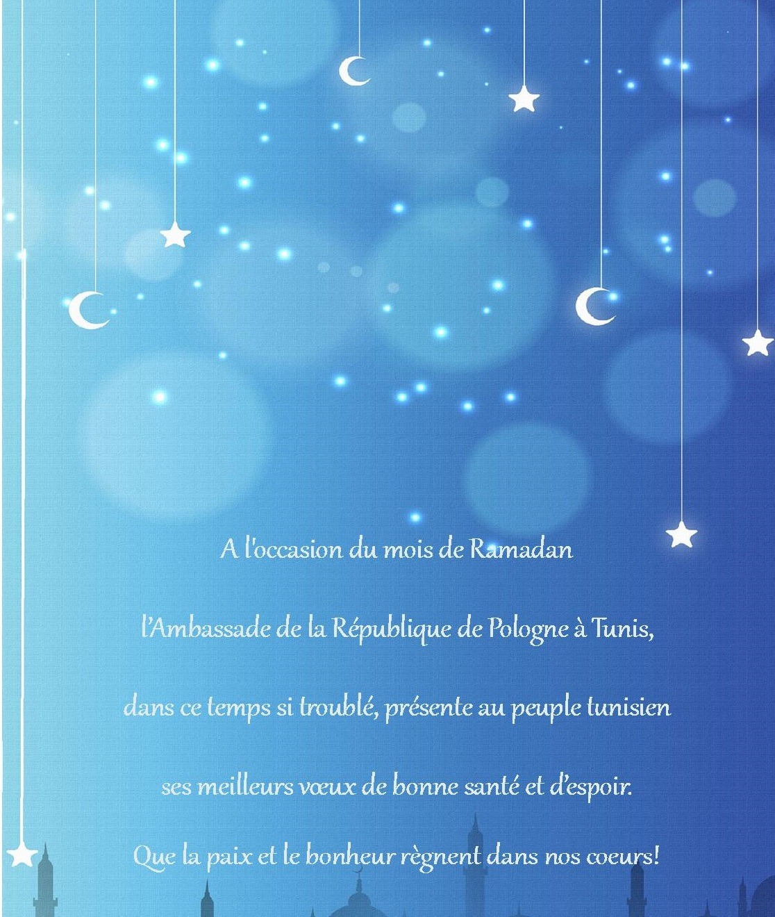 A l'occasion du mois de Ramadan l'Ambassade de la République de Pologne à Tunis présente au peuple tunisien ses meilleurs voeux de bonne santé et d'espoir.
