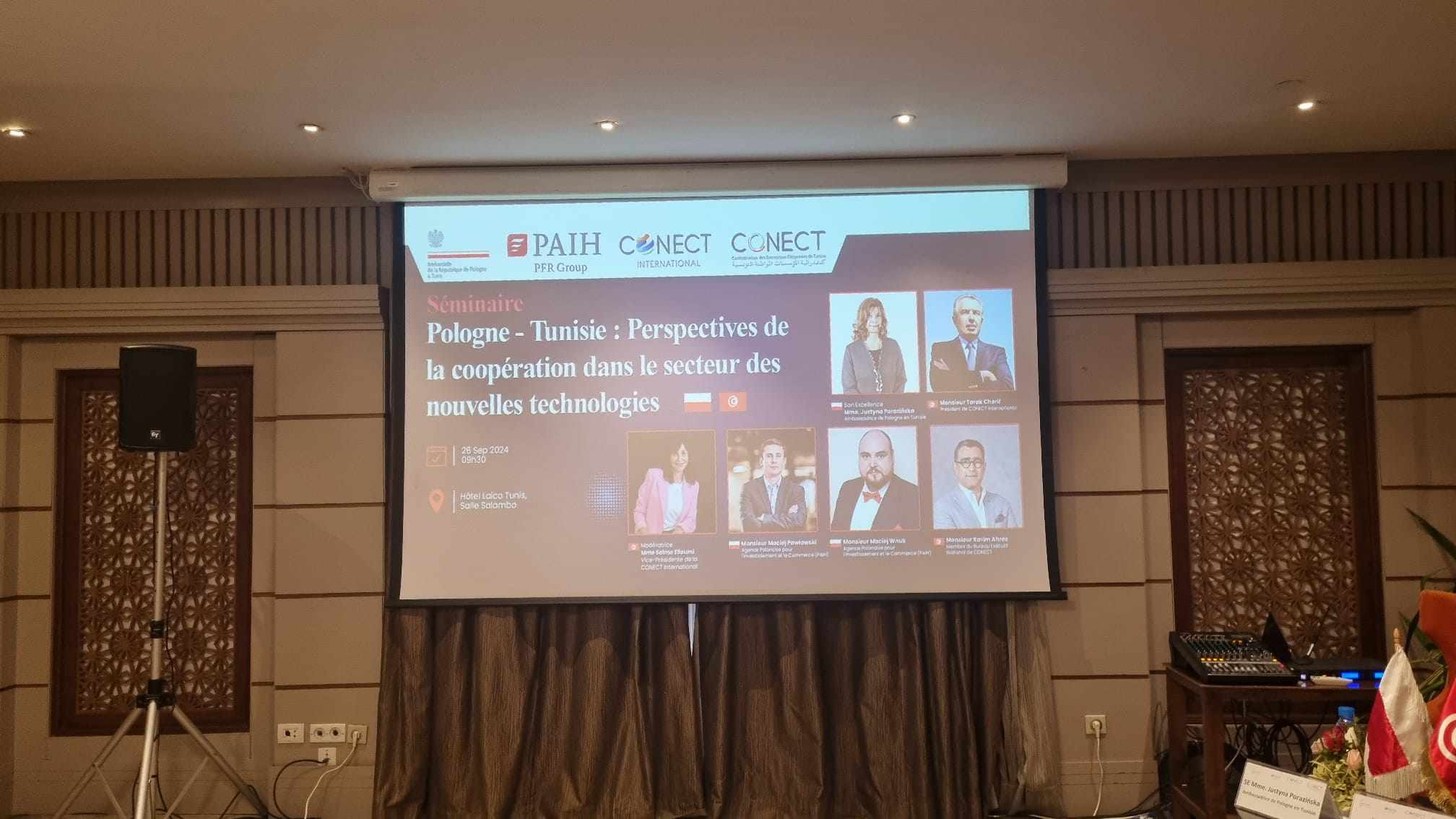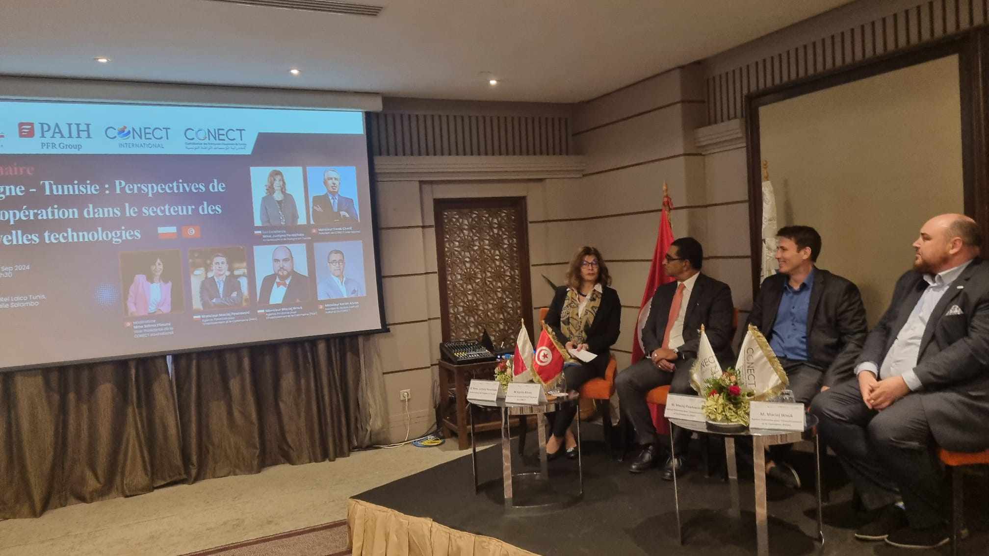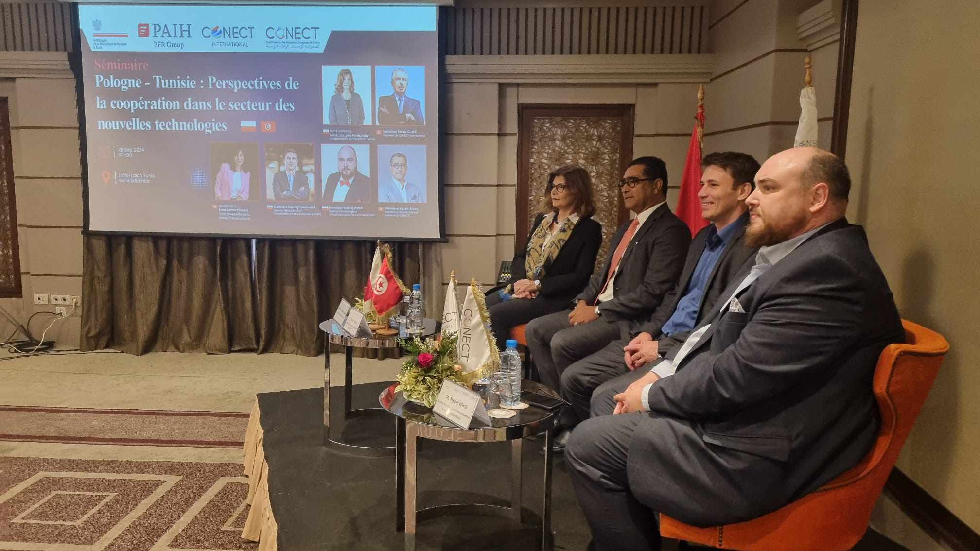 Le séminaire intitulé « Pologne - Tunisie. Perspectives de coopération dans le secteur des nouvelles technologies » s’est tenu le 26 septembre 2024. Son but était de promouvoir la coopération économique entre la Pologne et la Tunisie dans ce domaine. L'événement a été organisé par l'Ambassade de la République de Pologne à Tunis en coopération avec l'Agence Polonaise d'Investissement et de Commerce (PAIiH) et le partenaire local, la Confédération des Entreprises Citoyennes de Tunisie Conect International.
