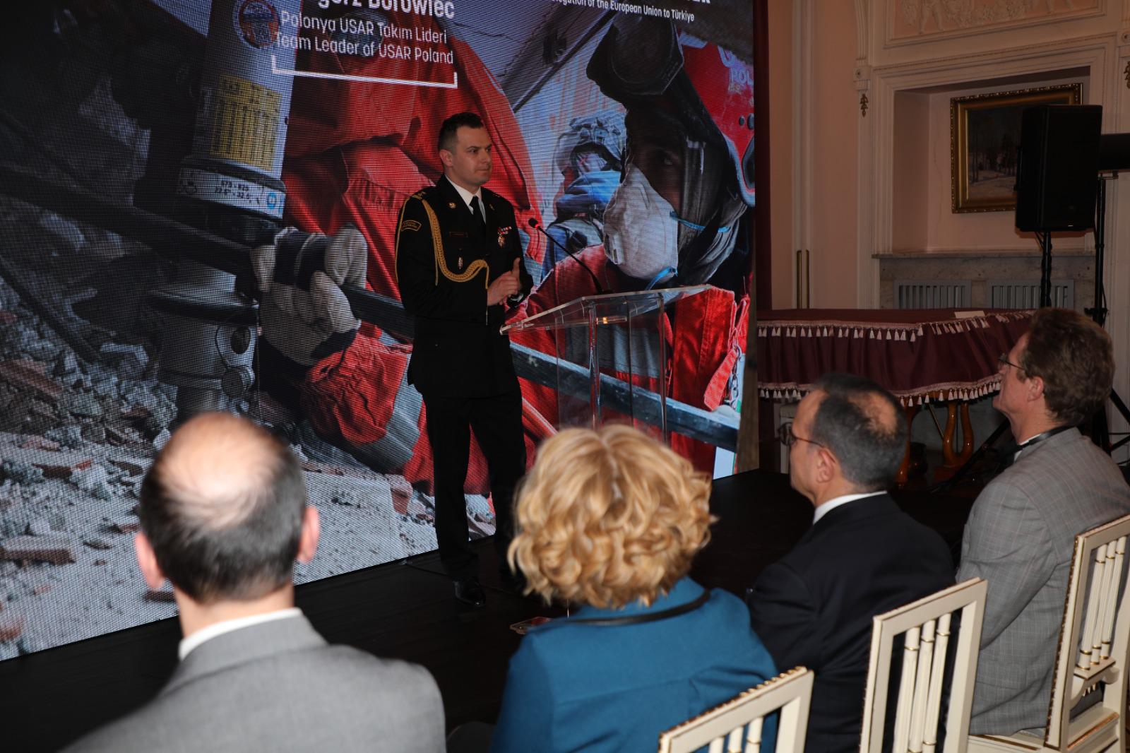 USAR Grup Komutanı Grzegorz Borowiec'in, Adıyaman'ın Besni ilçesinde gerçekleştirilen kurtarma çalışmaları hakkında kişisel deneyimlerini paylaştığı konuşması, katılımcıları derinden etkileyerek, etkinliğin ayakta alkışlarla sonlanmasına vesile oldu.