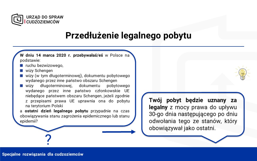 dotyczy sytuacji, w których ostatni dzień legalnego pobytu przypadnie na czas obowiązywania stanu zagrożenia epidemicznego lub stanu epidemii. Jest to zatem okres od 14 marca 2020 r., kiedy ogłoszono stan zagrożenia epidemicznego. Wówczas okres legalnego pobytu w Polsce będzie ulegał przedłużeniu z mocy prawa do upływu 30-go dnia następującego po dniu odwołania tego stanu, który obowiązywał jako ostatni.