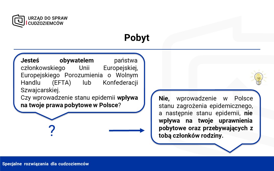 Wprowadzenie w Polsce stanu zagrożenia epidemicznego, a następnie stanu epidemii, nie wpływa w żaden sposób na prawa pobytowe obywateli państw członkowskich Unii Europejskiej, Europejskiego Porozumienia o Wolnym Handlu (EFTA), Konfederacji Szwajcarskiej i przebywających z nimi członków rodzin. Uprawnienia te nie są bowiem uzależnione od posiadania jakichkolwiek zezwoleń czy dokumentów.