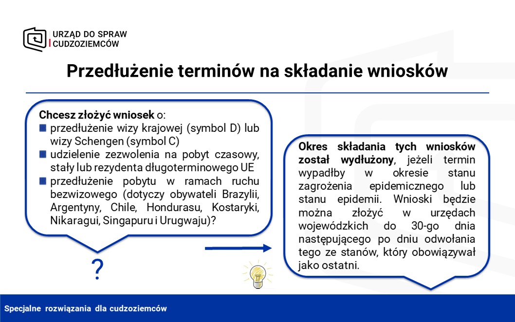 Ustawa wprowadza wydłużenie terminów składania wniosków o udzielenie zezwoleń pobytowych, przedłużenie wiz oraz przedłużenie pobytu w ramach ruchu bezwizowego, jeżeli termin ten wypadłby w okresie stanu zagrożenia epidemicznego lub stanu epidemii. Jak dotychczas, wnioski te będzie można złożyć w urzędach wojewódzkich do 30-go dnia następującego po dniu odwołania stanu, który obowiązywać będzie jako ostatni.