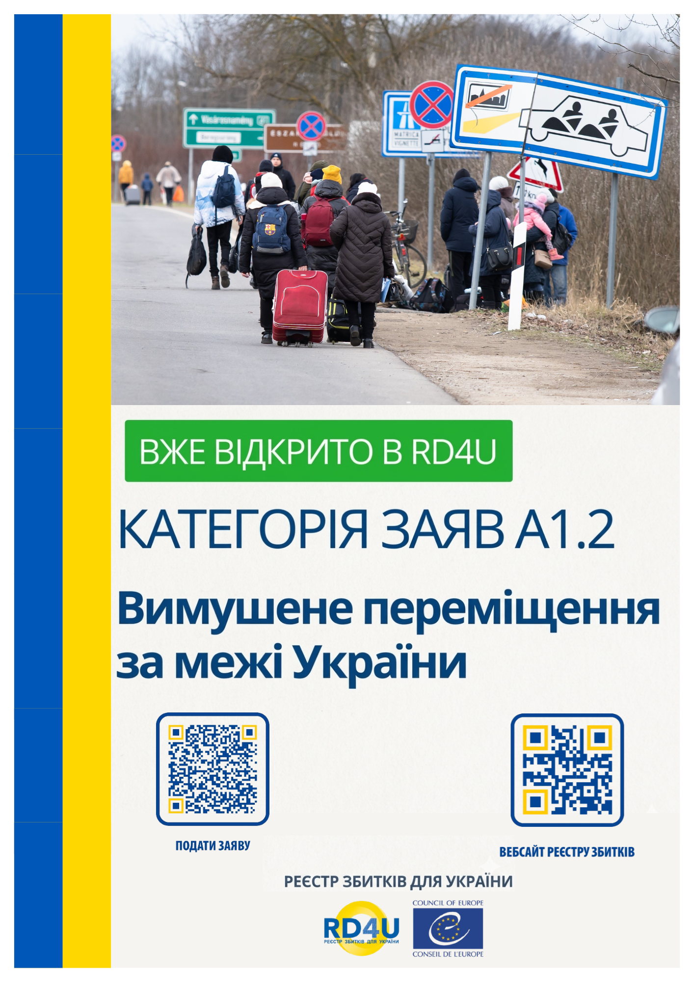 Nowa kategoria A1.2 (Przymusowe przesiedlenie poza granice Ukrainy) umożliwia składanie wniosków o odszkodowanie osobom, które zostały zmuszone do opuszczenia swoich domów i wyjazdu za granicę lub które nie mogły powrócić do Ukrainy w następstwie agresji Federacji Rosyjskiej. Osoby, które otrzymały ochronę czasową lub ochronę międzynarodową w Polsce lub w innym państwie w wyniku pełnoskalowej inwazji, będą dla celów tej kategorii uznawane za osoby przymusowo przesiedlone poza granice Ukrainy. Osoby, które nie posiadają oficjalnego statusu, będą musiały przedstawić inne dowody potwierdzające fakt przymusowego przesiedlenia.