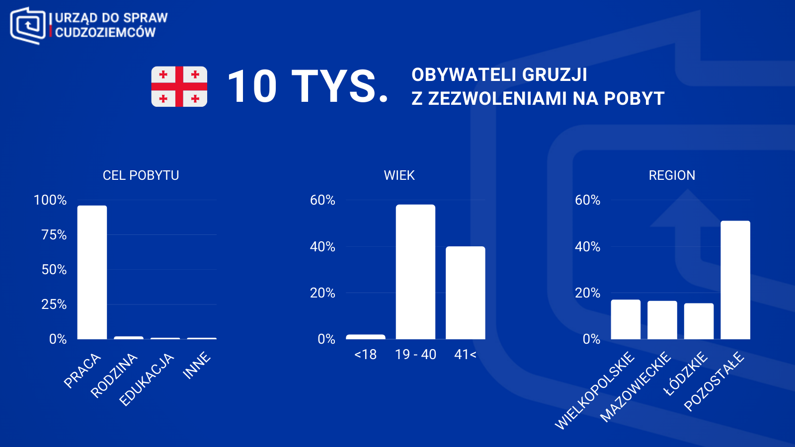 Niemal wszyscy Gruzini – 96 proc. osób, posiadają zezwolenia na pobyt czasowy. Mogą być one wydane na maksymalnie 3 lata. Najczęstszym celem pobytu w Polsce jest podejmowanie pracy – 96 proc. spraw. W dalszej kolejności są kwestie rodzinne – 2 proc. oraz edukacja – 1 proc.
