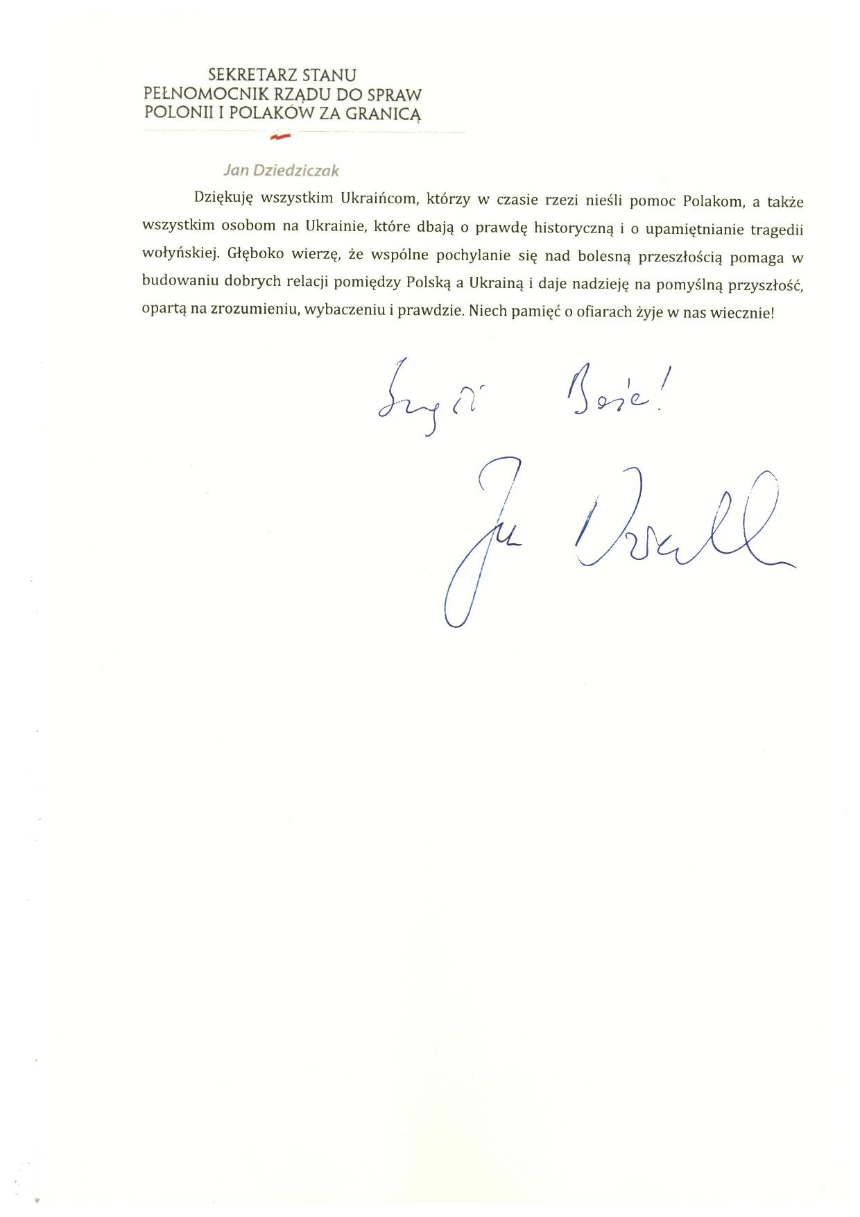 Лист державного секретара уповноваженого уряду з питань польської діаспори та поляків за кордоном Яна Джєджічака до учасників та організаторів урочистостей, присвячених 78-й річниці Волинського злочину
