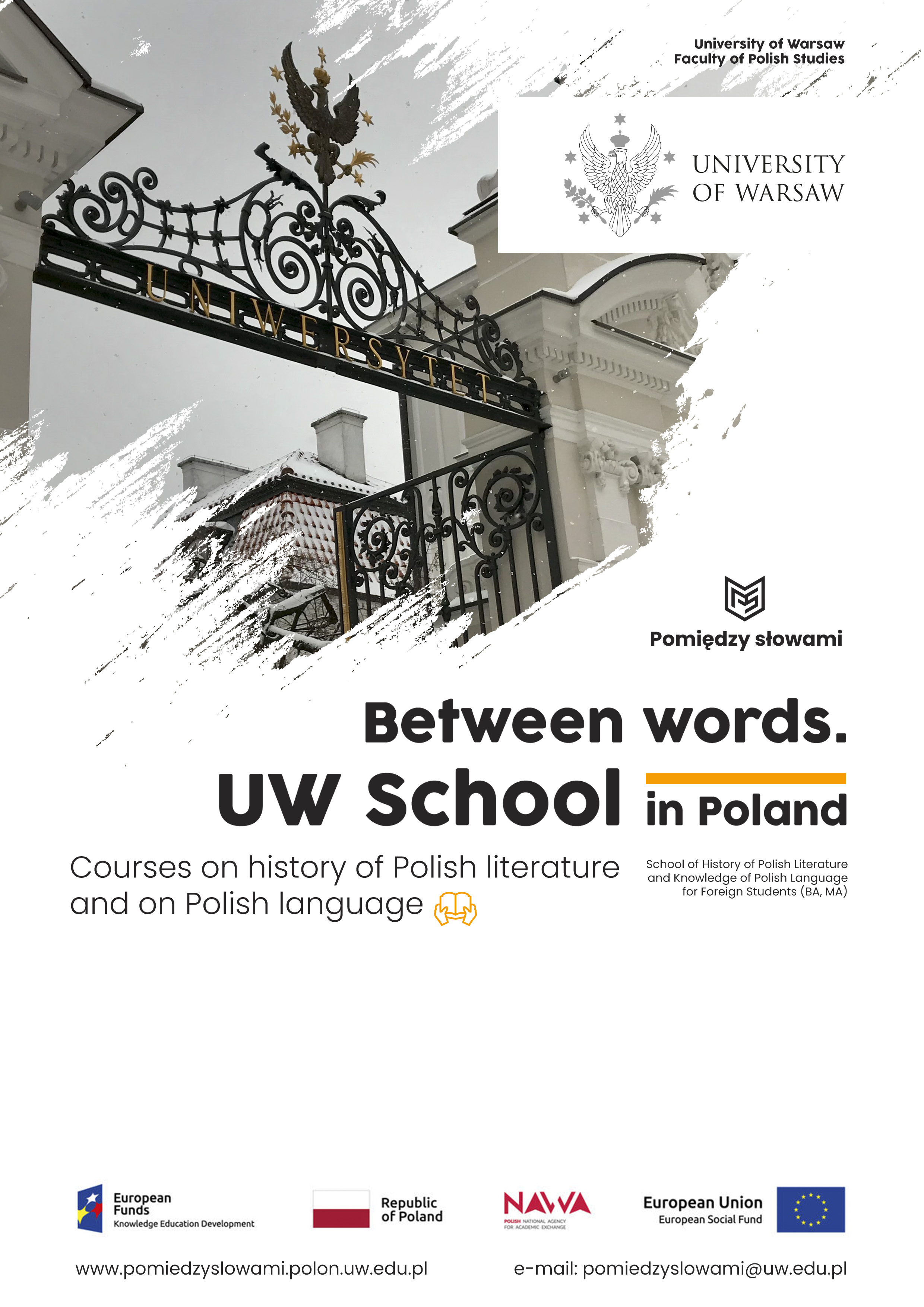 Програма співфінансується за кошти Європейського Соціального Фонду. Метою проекту є організація на Факультеті Полоністики Варшавського університету (в Інститутах Польської Літератури та Польської Мови) Школи історії польської літератури та знань про польську мову для іноземних студентів (навчання I та II ступеня). Заняття англійською та німецькою мовами відбудуться у дві сесії: зимову (онлайн: 15/11-5/12/2021) та літню (онлайн: 25-29/05 та на місці: 9-13/05/2022).