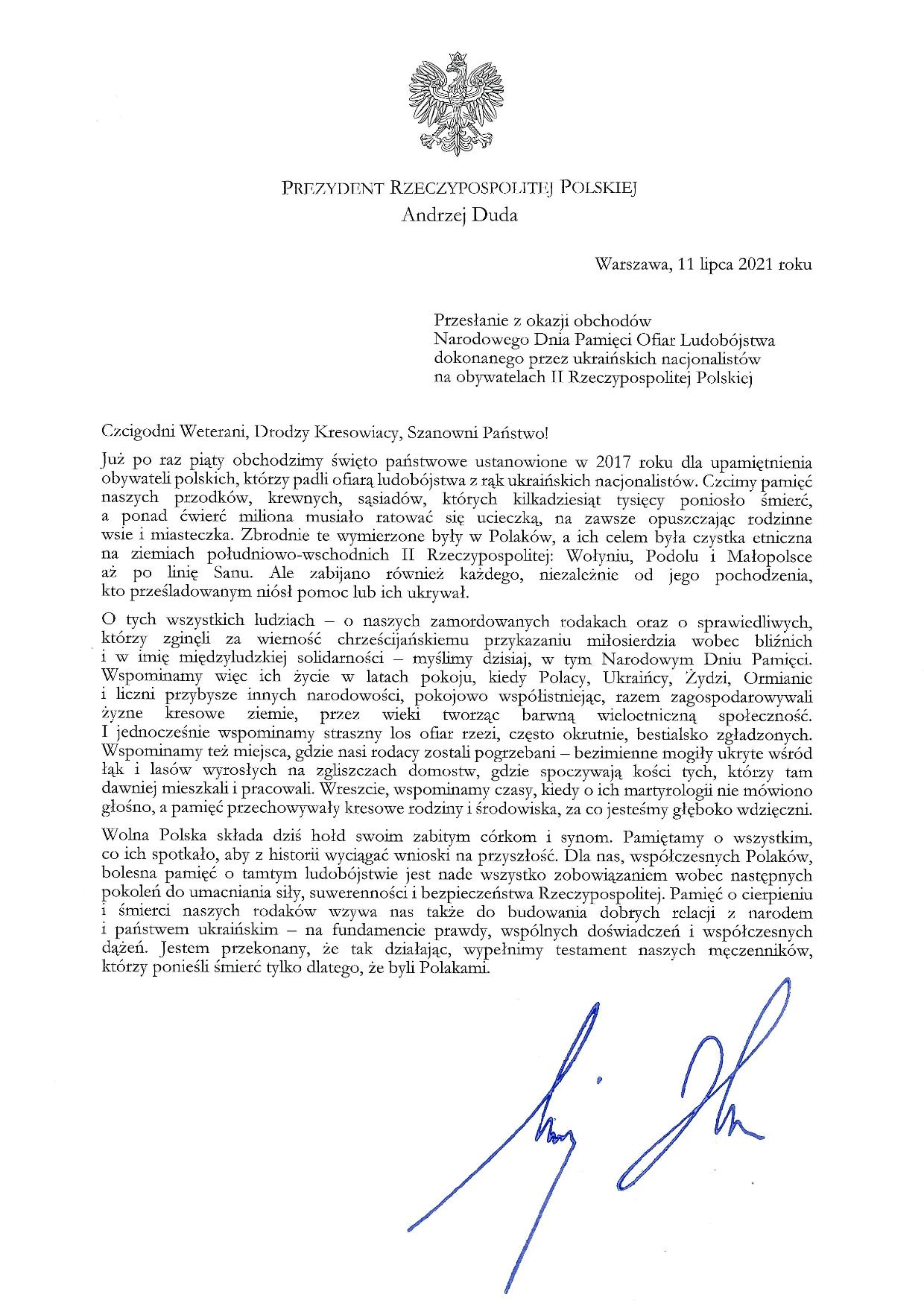 Сьогодні Вільна Польща віддає шану своїм загиблим дочкам та синам. Ми пам’ятаємо все, що з ними відбувалося, щоб вчитися з історії на майбутнє. Для нас, сучасних поляків, болюча пам'ять про цей геноцид є перш за все зобов'язанням перед наступними поколіннями зміцнювати силу, суверенітет та безпеку Речі Посполитої. Пам'ять про страждання та смерть наших співвітчизників також зобов'язує нас будувати добрі стосунки з українською нацією та державою - на основі правди, спільного досвіду та сучасних прагнень. Я переконаний, що, діючи таким чином, ми виконаємо волю наших мучеників, які загинули лише тому, що були поляками.