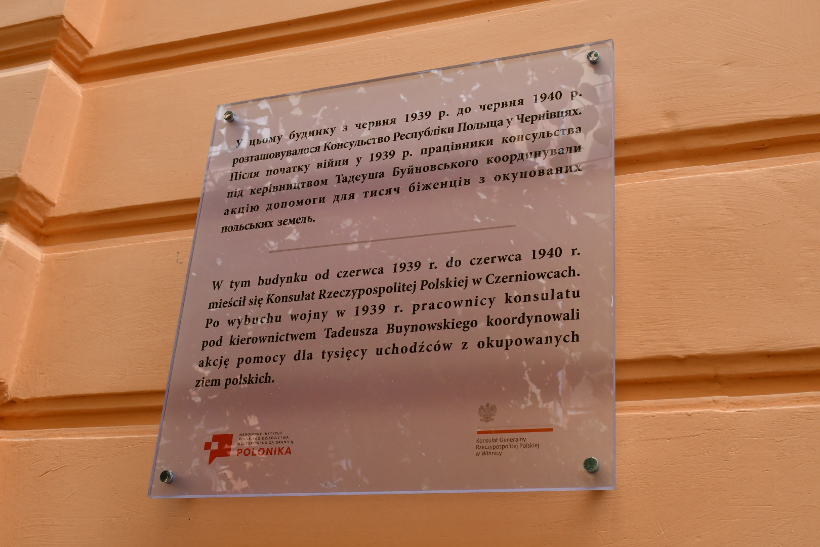 Генеральний консул РП у Вінниці Дамян Цярціньскі, віце-директор Національного інституту польської культурної спадщини за кордоном «Полоніка» Агнєшка Тиміньска та представники місцевої влади урочисто відкрили пам'ятну дошку на будівлі за адресою вул. Вірменська 14 в Чернівцях, в якій в 1939 - 1940 рр. було розташоване Консульство Республіки Польща.