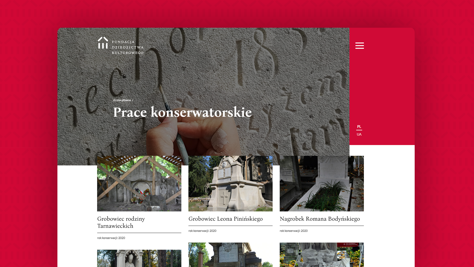 Strona prezentuje też efekty prac konserwatorskich prowadzonych ze środków Ministerstwa Kultury i Dziedzictwa Narodowego od 2008 roku. W latach 2008-2012 prace prowadziło Towarzystwo Opieki nad Zabytkami, a od 2013 r. prowadzi je Fundacja Dziedzictwa Kulturowego.